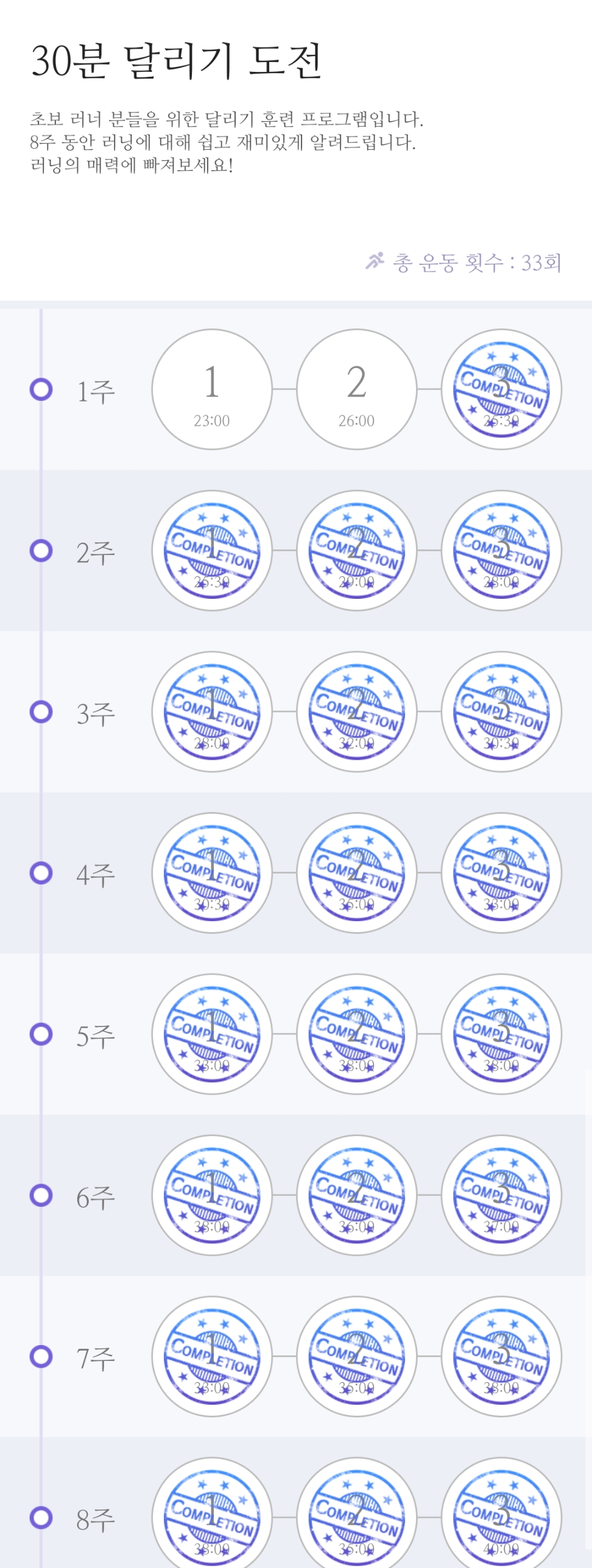 런데이 8주 플랜은 보통 속도로 걷기와 조금 빠르게 달리기, 두 단계를 번갈아가며 진행하는 인터벌 트레이닝이다. 가이드가 음성으로 계속 남은 시간을 알려주고, 달릴 때와 쉴 때를 알려준다. 중간중간 뛰는 자세나 운동화 고르는 법, 운동복 고르는 법 등을 설명해주고 격려를 해주기도 한다. 할 수 있습니다!!! 이제 거의 다 왔습니다!! 뭐 이런...