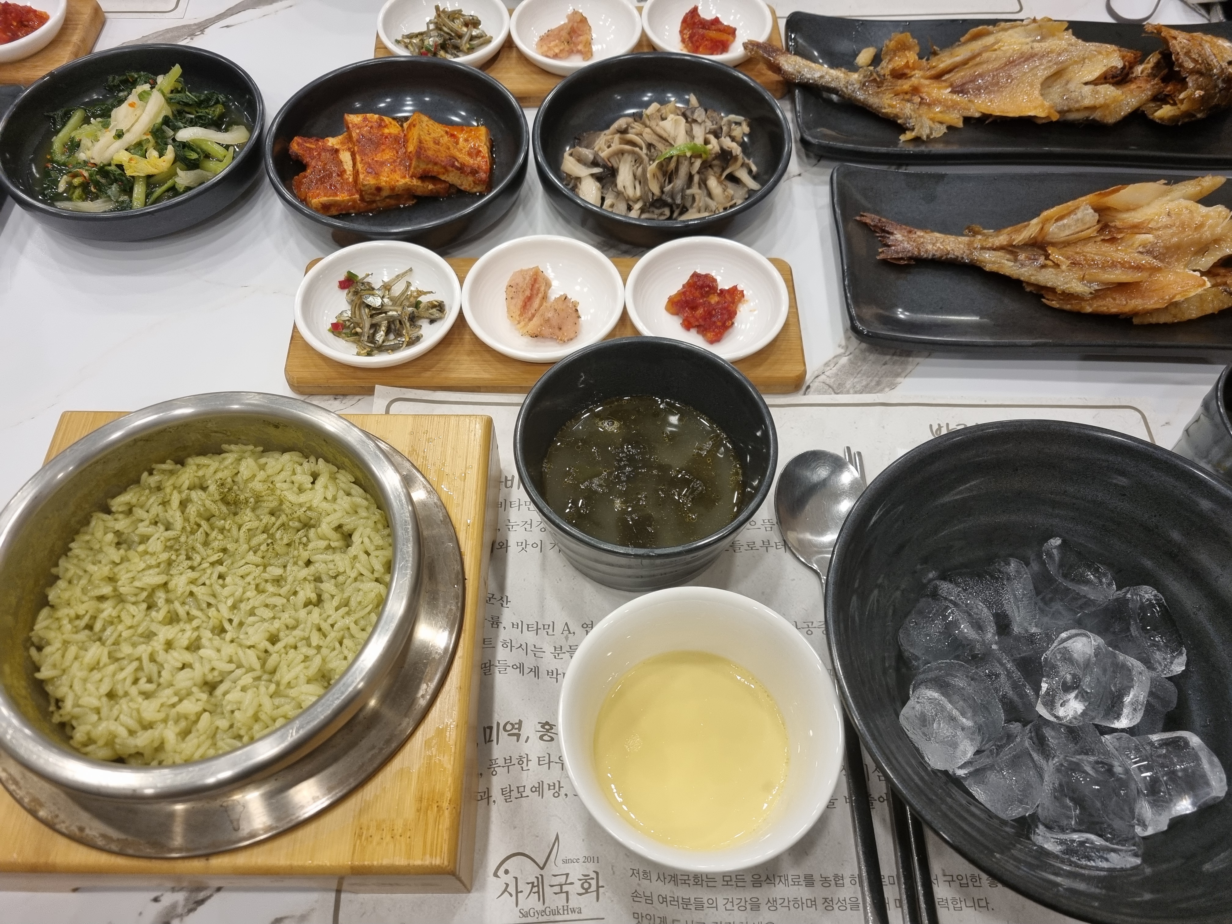 기본 세팅이 꽤나 풍족하다. 인별로 계란찜과 미역국, 젓갈이 제공되고 공동 반찬도 있음! 그리고 보리굴비!!! 보리굴비 때깔이 장난 아니다. 약간 딱딱한 편이고 가시가 있으니 좀 조심해서 먹어야 하는데 짭조름하니 간이 적당해서 밥도둑이다.