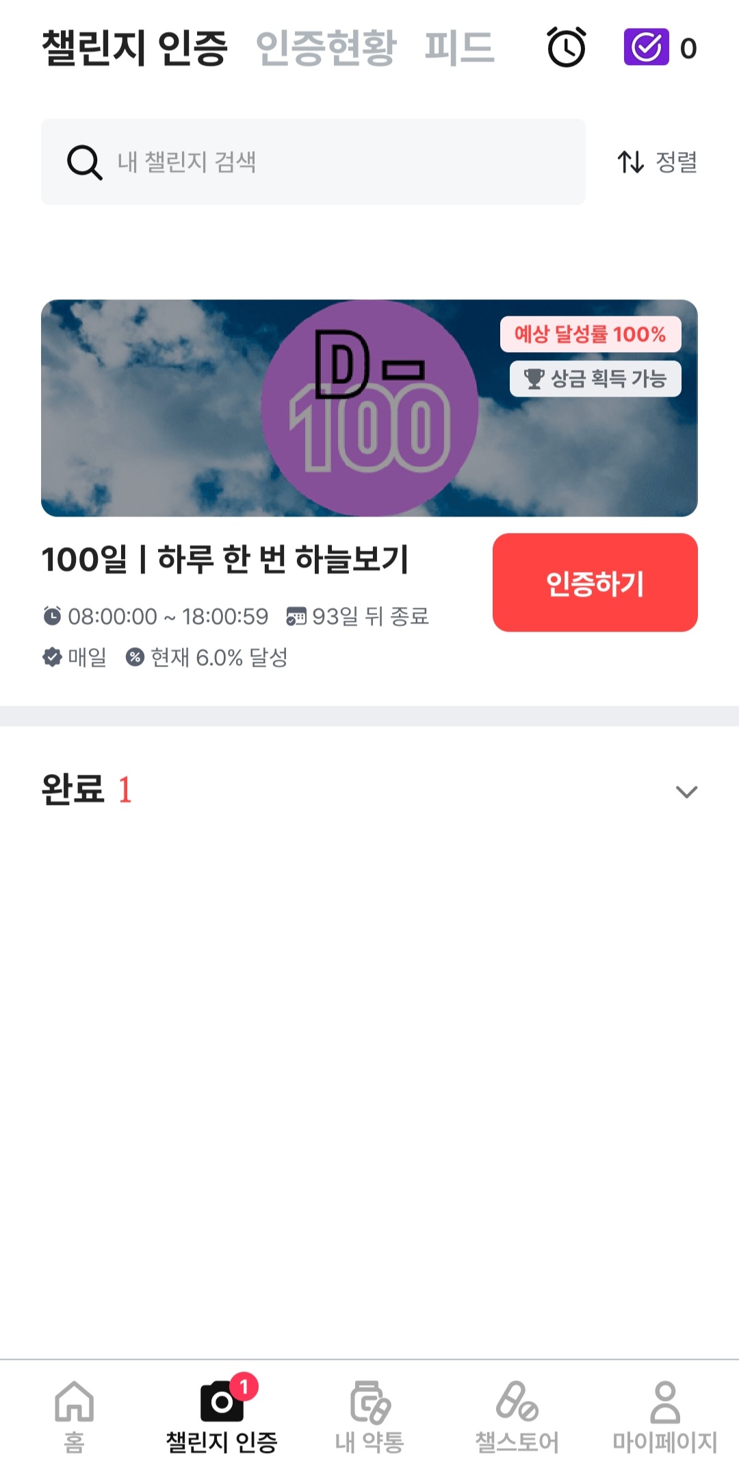 하단의 왼쪽에서 두 번째, 챌린지 인증 탭에 가면 내가 현재 참여 중인 챌린지와 챌린지 참여 가능 시간, 인증 완료 여부 등을 한눈에 파악할 수 있다. UI가 매우 편리한 편. 각 챌린지의 "인증하기" 버튼을 누르면 바로 카메라로 연동되는데, 그때 인증 조건에 맞는 사진을 찍은 후 메모를 달면 인증 완료!!