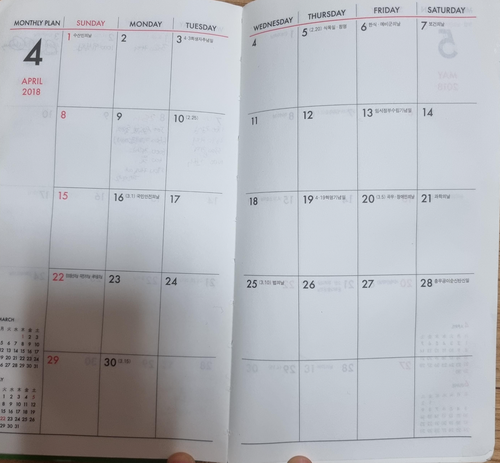 마찬가지로 한 달 월간 달력 뒤에 바로 해당 월의 주간 일정이 반복된다. 주간일정도 한주가 한 장에 다 보인다. 하드커버가 아니지만 다른 탄탄해서 질 휘어지지는 않는다. 주간 일장에 일일 일정을 적는 칸이 큼직해서 편했다.