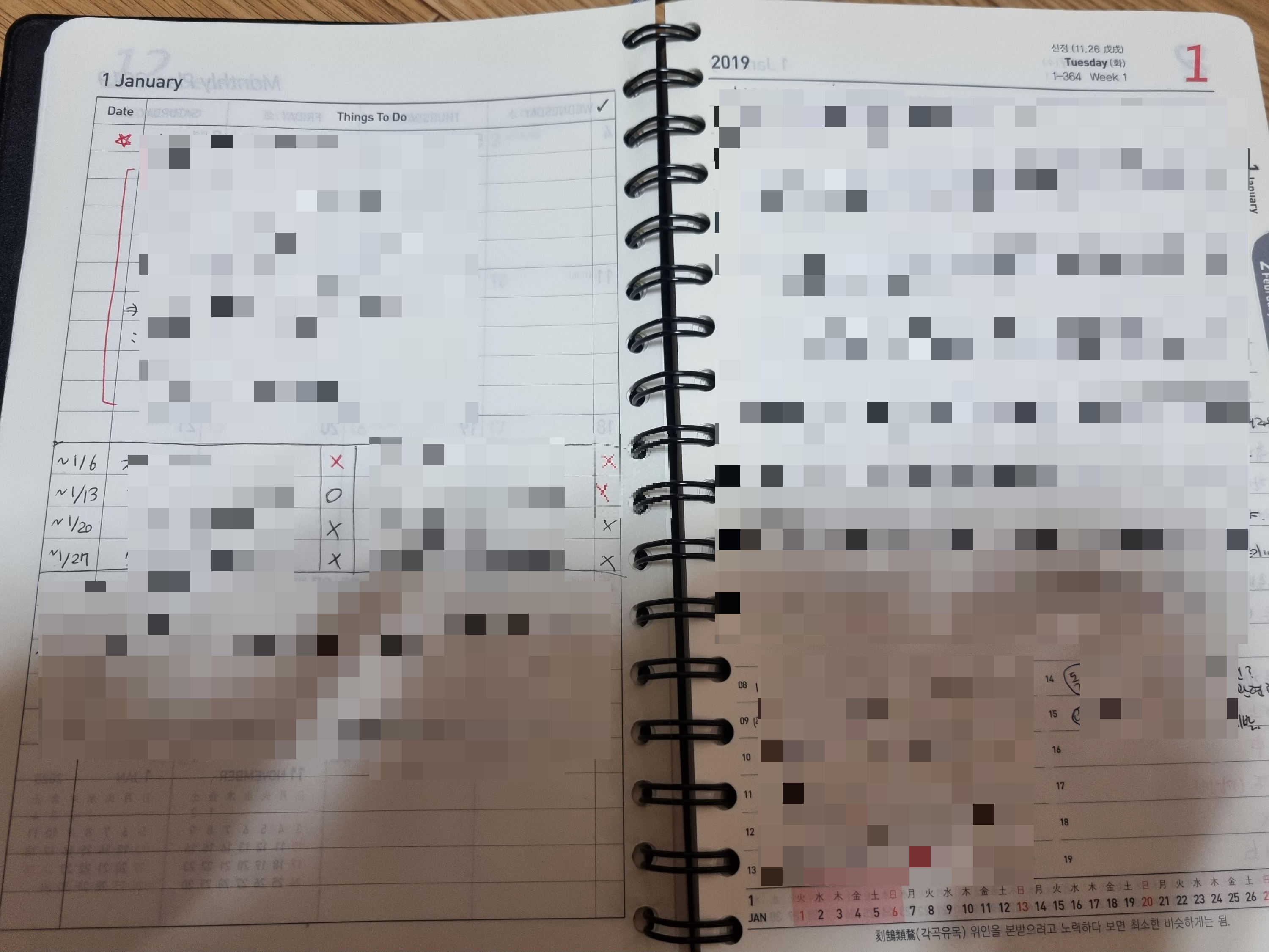 월간 달력이 1~12월까지 한 번에 나오고 그 뒤로 일간 노트가 나온다. 주간 달력이 없고 일자력만 있어 페이지수가 굉장히 많다. 물론 매달 맨 첫 장에서 to do list가 있다. 일간 달력은 넓게 줄글이 있고 하단에 시간대별 할 일을 적어놓을 수 있는 공간으로 구분된다. 이때는 플래너보다 일기를 쓸 수 있는 '다이어리'를 찾고 있었기 때문에 선택한 처음이자 마지막 일력 다이어리. 이때는 매일 주제를 가지고 일기를 썼던 걸로 기억한다. 예를 들어, 내 인생에서 추구하는 궁극적 목표는? 오늘 행복했던 순간은? 이런... 인터넷에서 자기 관리 글들을 찾아보고 썼던 주제들이다.