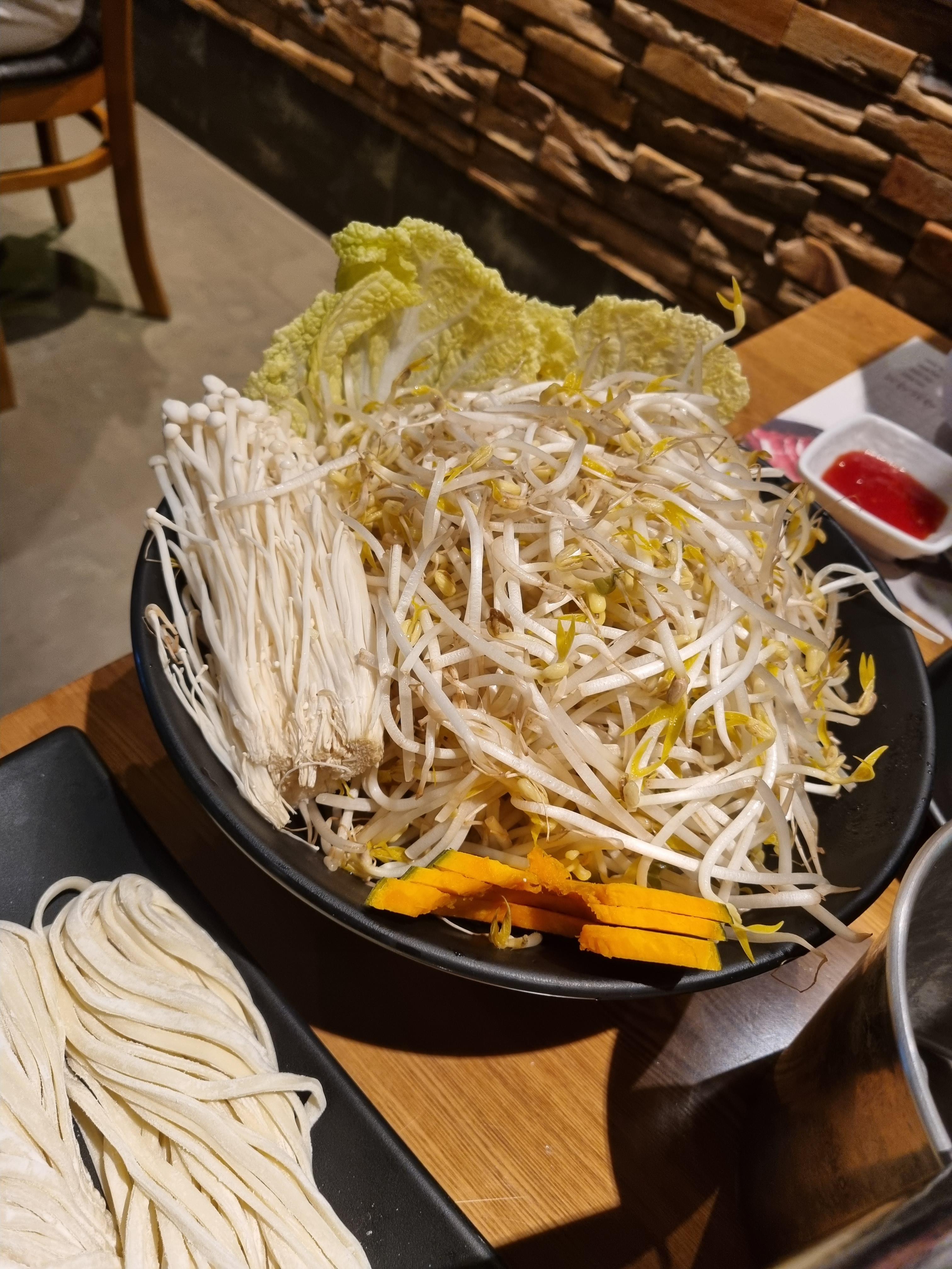 냄비는 테이블당 하나가 나와서 1인 1냄비가 나오는 녹향과는 다르다. 소스는 간장소스와 매콤한 칠리소스로 두 가지가 나오는데, 나는 간장 소스민 찍어 먹는다!! 샤브샤브는 육수와 소스가 가장 중요한데 둘 다 아주 합격점. 1인당 고기는 한 접시가 나옴.