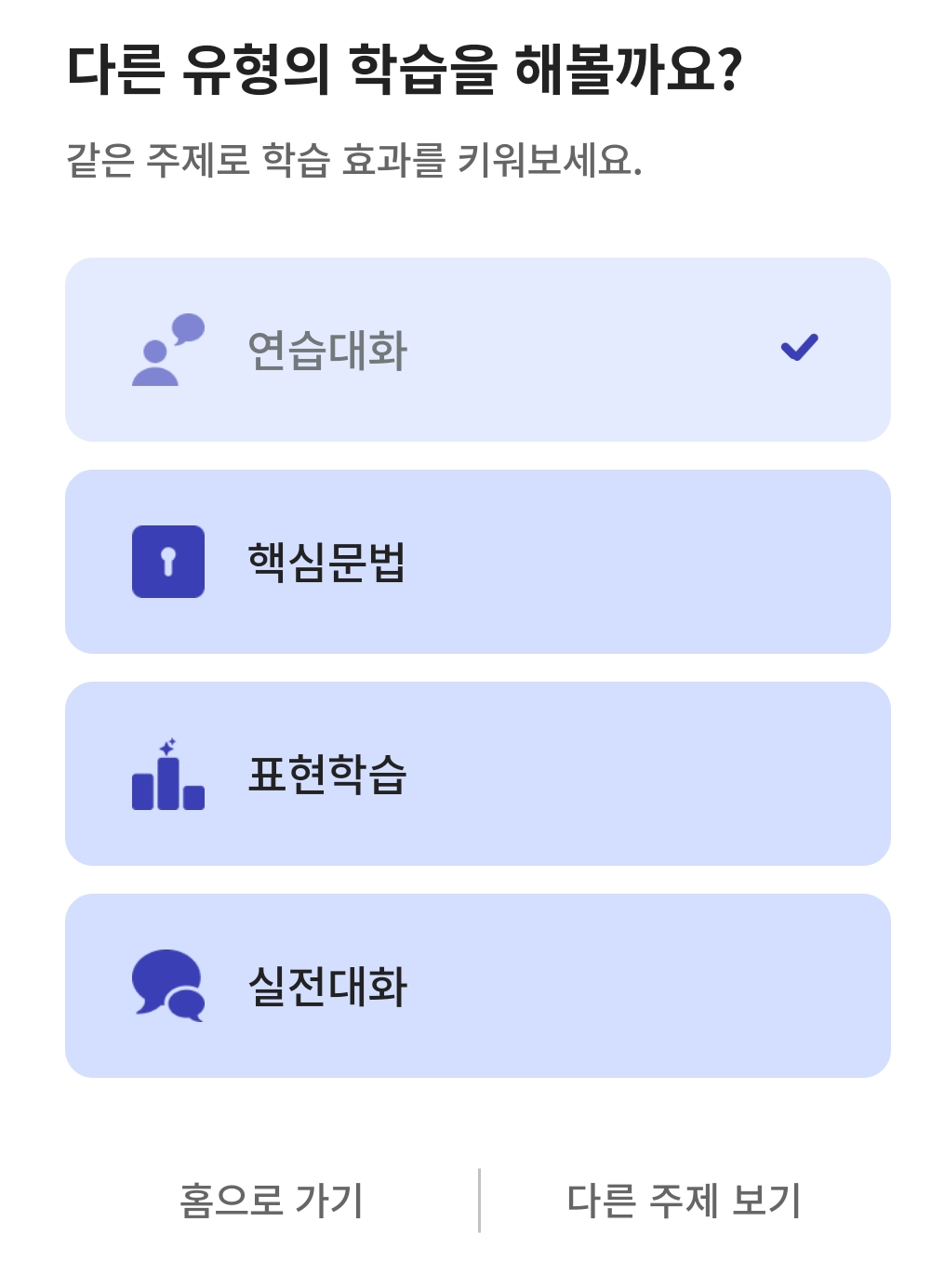 1차적으로 연습대화가 끝나면 그다음 학습 소개가 나온다. 하단의 위 꺾쇠를 누르면 아래의 창이 나오는데, 같은 주제로 핵심문법, 표현학습, 실전대화를 진행할 수 있다.