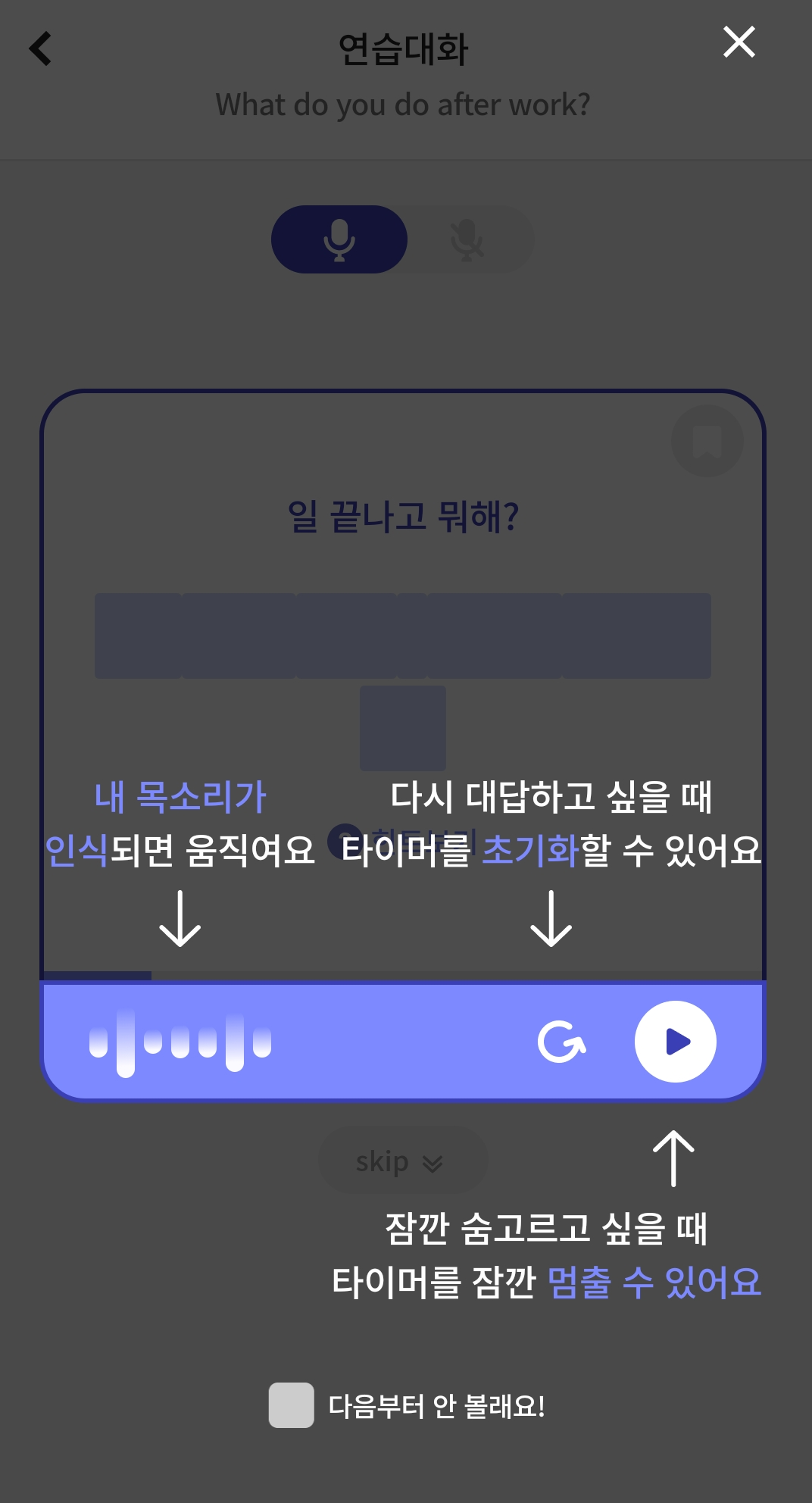 ++근데 가끔 인식률이 너무 떨어진다. 내가 말하는 게 늦게 인식되어 답변의 두 번째 기회가 자동으로 날라가거나 연습대화가 skip되어 갑자기 종료된다. 내 핸드폰의 문제인지는 모르겠지만 오류가 계속되면 좀 신경쓰이긴 한다.