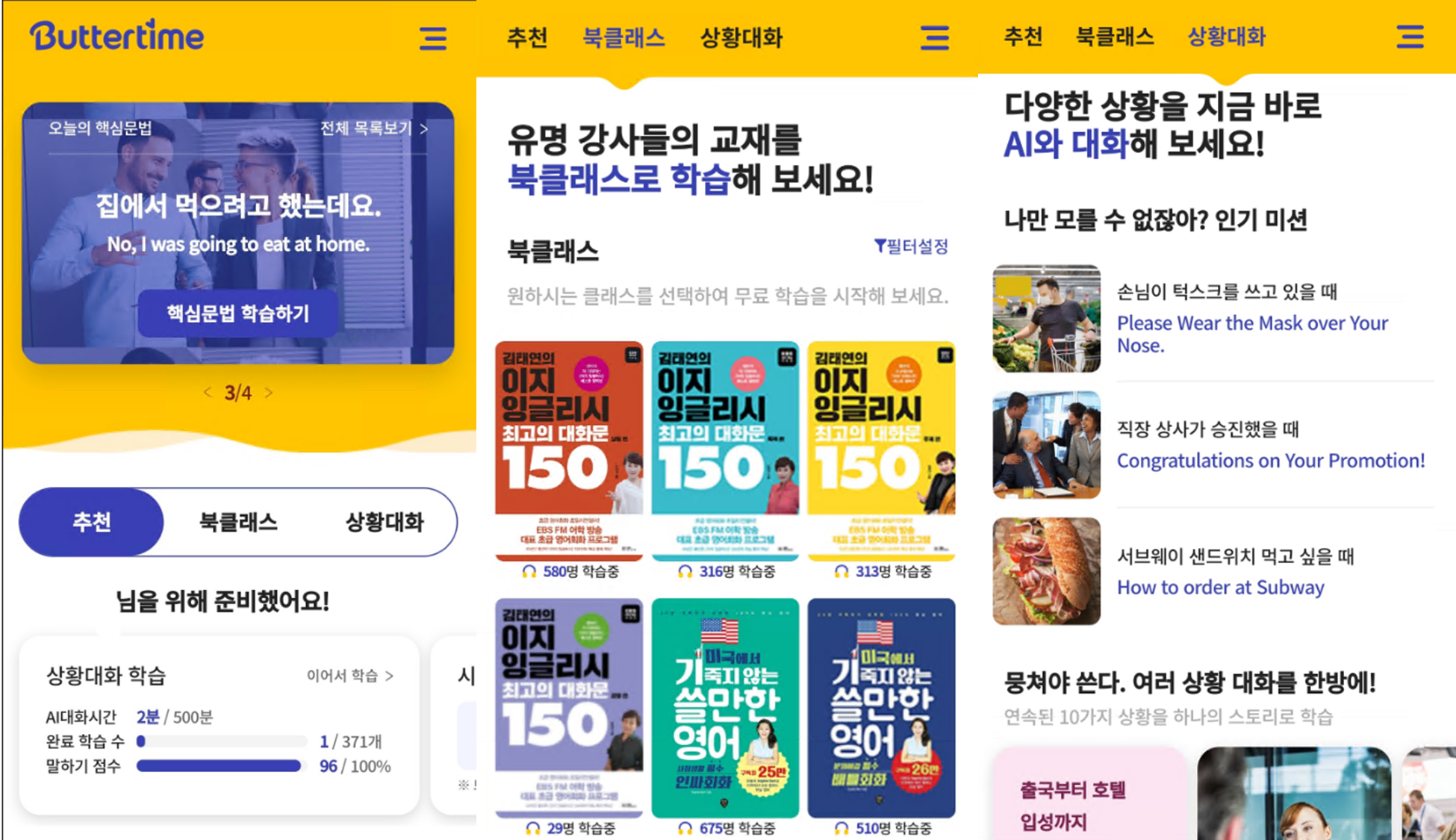 학습 카테고리는 크게 세 가지(주제는 각 카테고리별로 더 다양)로, -추천, 북클래스, 상황 대화가 있다.