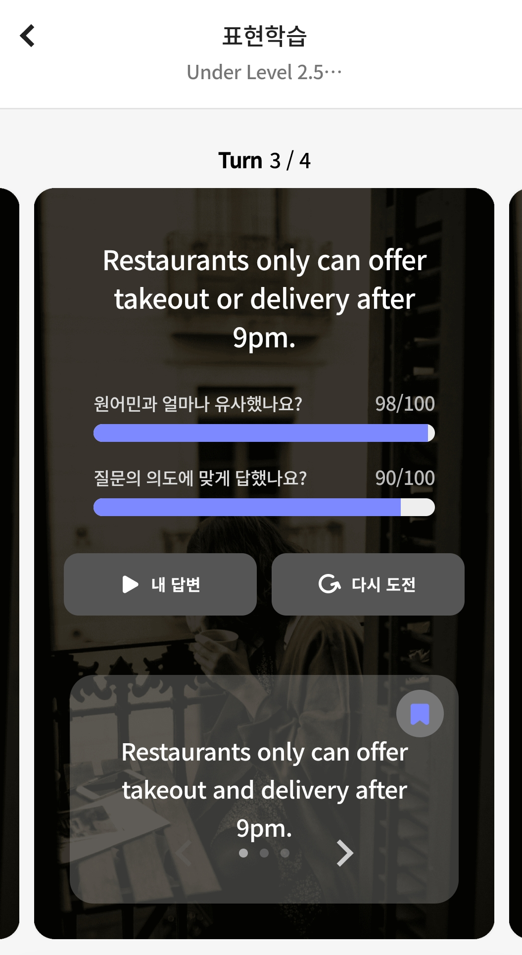 '표현학습'은 연습대화 중 내가 답변한 부분만 다시 연습해보는 것이다. 상대 AI의 음성이 나오고 내가 다시 답변한다는 건 '연습대화'와 같은데 추천 단어는 안 나오고 해석만 나온다. 그리고 음성으로 답변하면 그다음 아래 사진처럼 피드백이 나와 내가 말한 녹음본을 들어보고, 중앙의 영어문장을 누르면 원어민 음성이 나오기 때문에 나의 음성과 원어민 음성을 비교해볼 수 있다. 실제로 인토네이션이 비슷할수록 "원어민과 얼마나 유사했나요?"의 항목 점수가 올라가기 때문에 쉐도잉에도 최적화되어 있다. 나는 이 표현학습 콘텐츠를 가장 좋아한다!