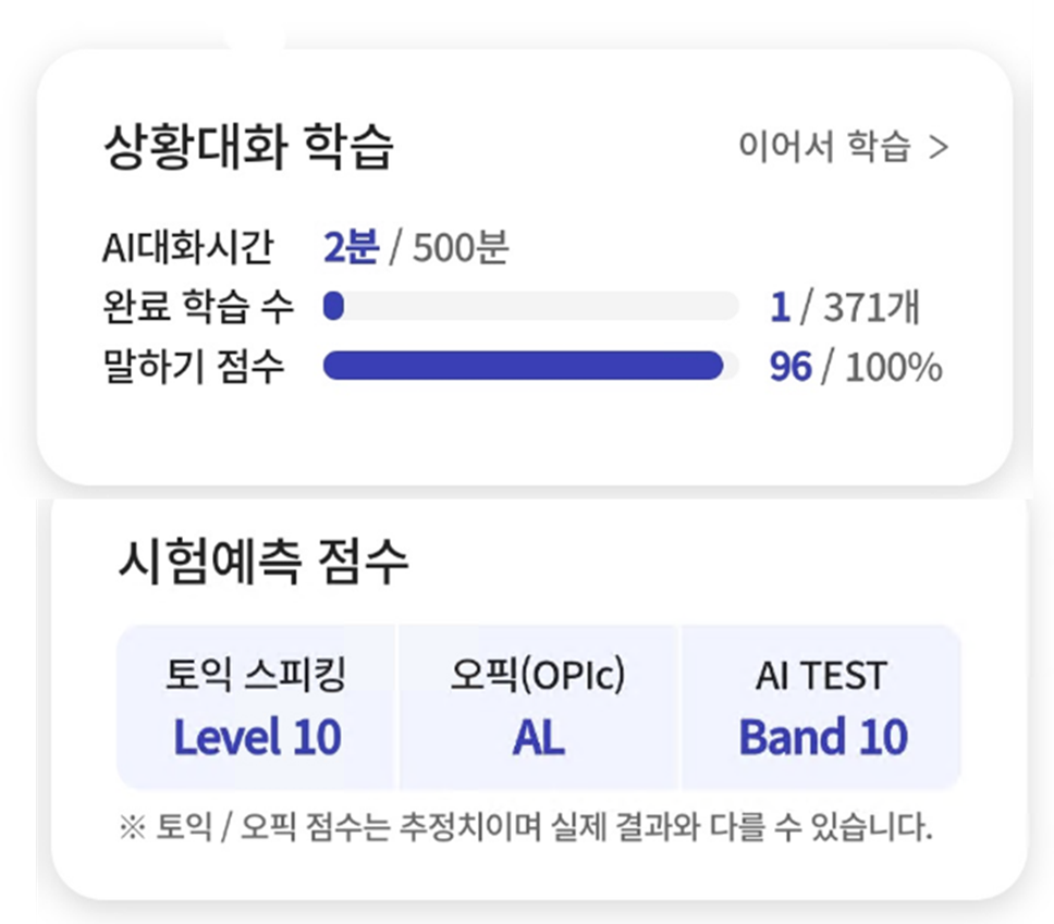 근데 심지어, 예측률도 좋다! 사진을 보면 알겠지만 처음 체험해보고 난 직후 메인 화면에서 나의 예상 시험 결과를 알 수 있다. 고작 2분 해봤는데 내 토스 시험은 레벨 10, 오픽 레벨은 AL로 나왔는데 매우 정확하다. 학습을 진행하면 진행할수록 예측 결과도 달라지기 때문에 누적된 데이터를 기반으로 나의 시험예측 점수의 정확도를 높일 수 있으니 참고하자.