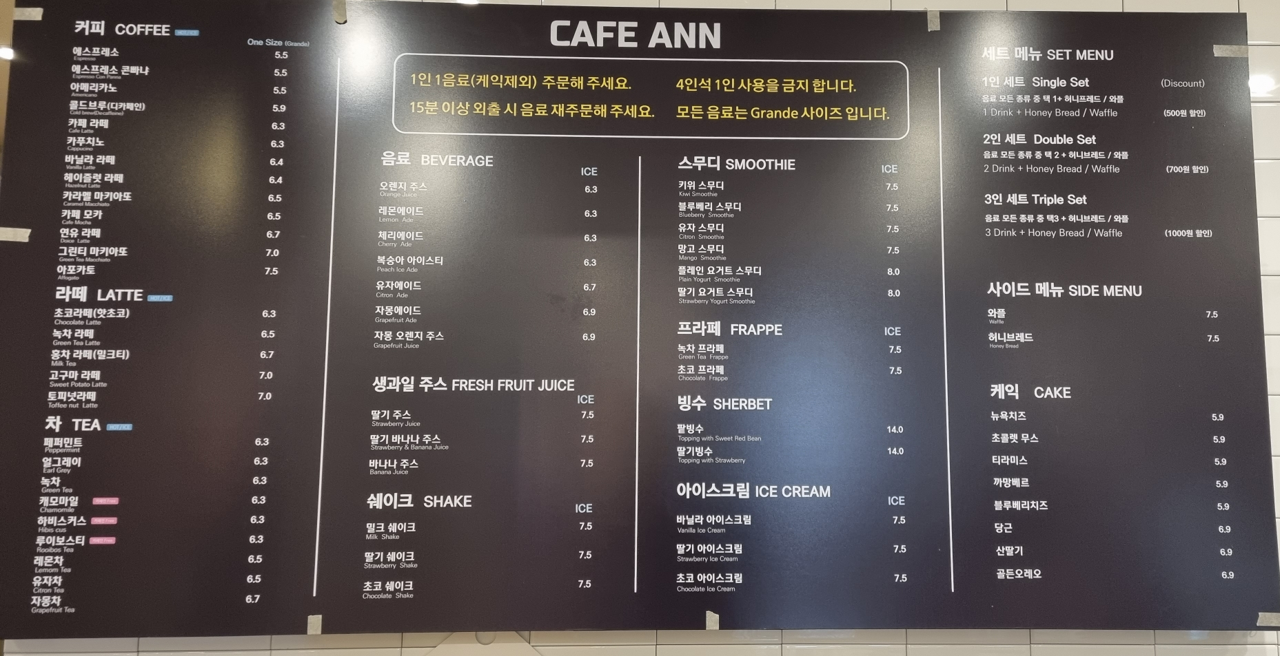 메뉴가 중요할까... 걍 스터디 카페 느낌이라 음료 가격대가 높은 편이며 사이즈는 그란데 사이즈로 통일됨.