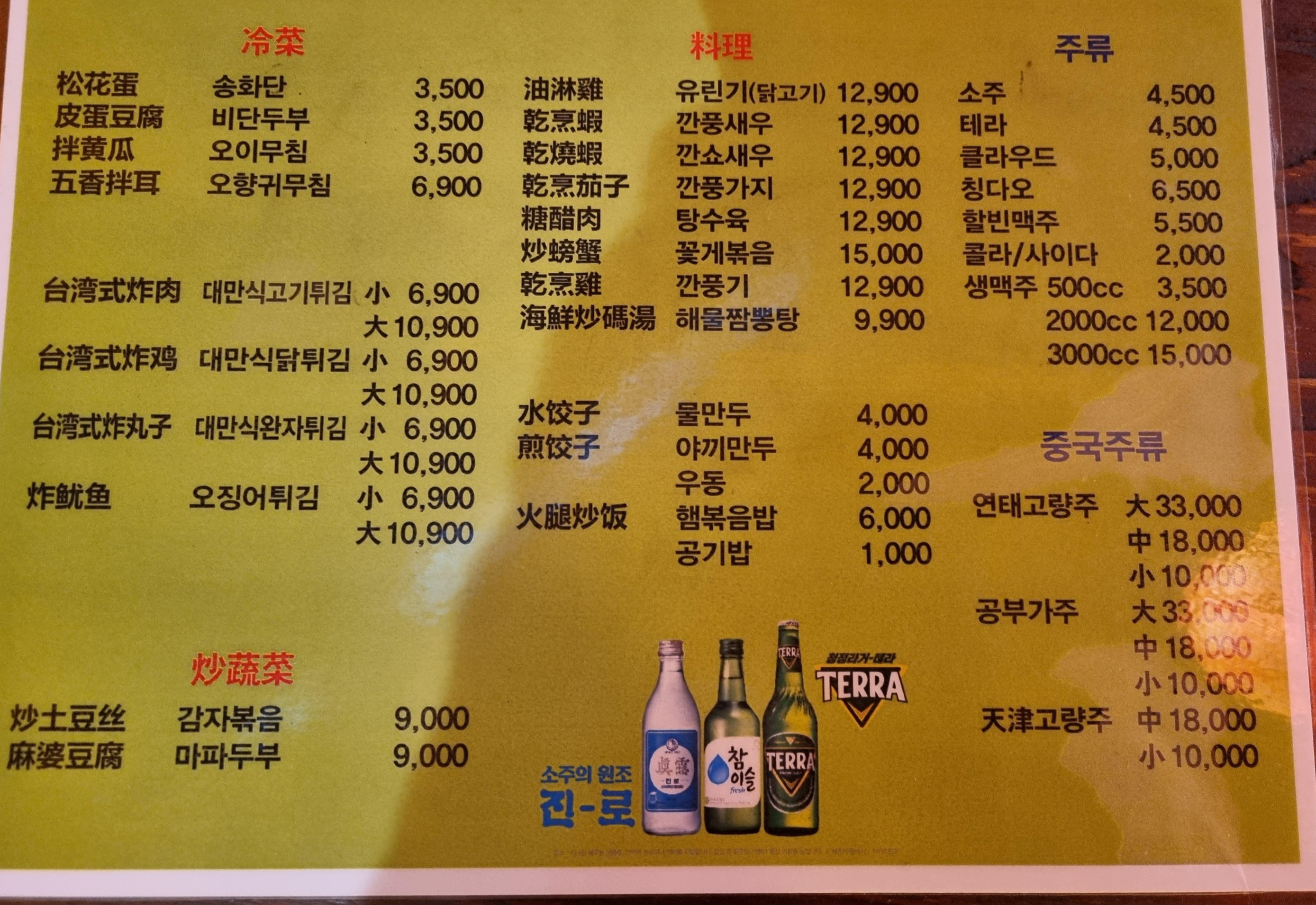 의외로 긴 영업시간. 사실 1~3차고 뭐고 여기서 가볍게 안주시켜먹고 소주 + 맥주 + 고량주로 달리려면 달릴 수 있는 장소이긴 하다.