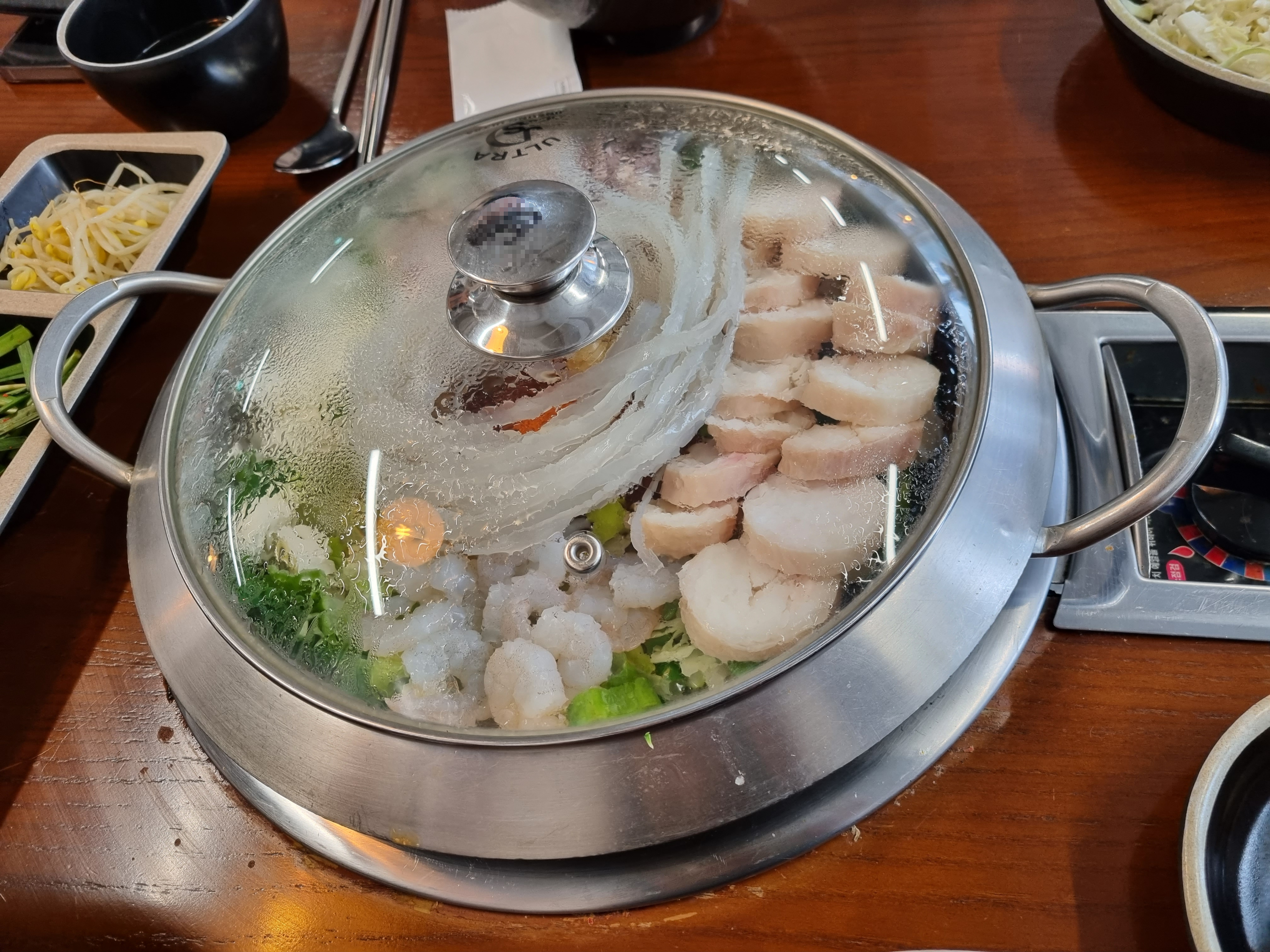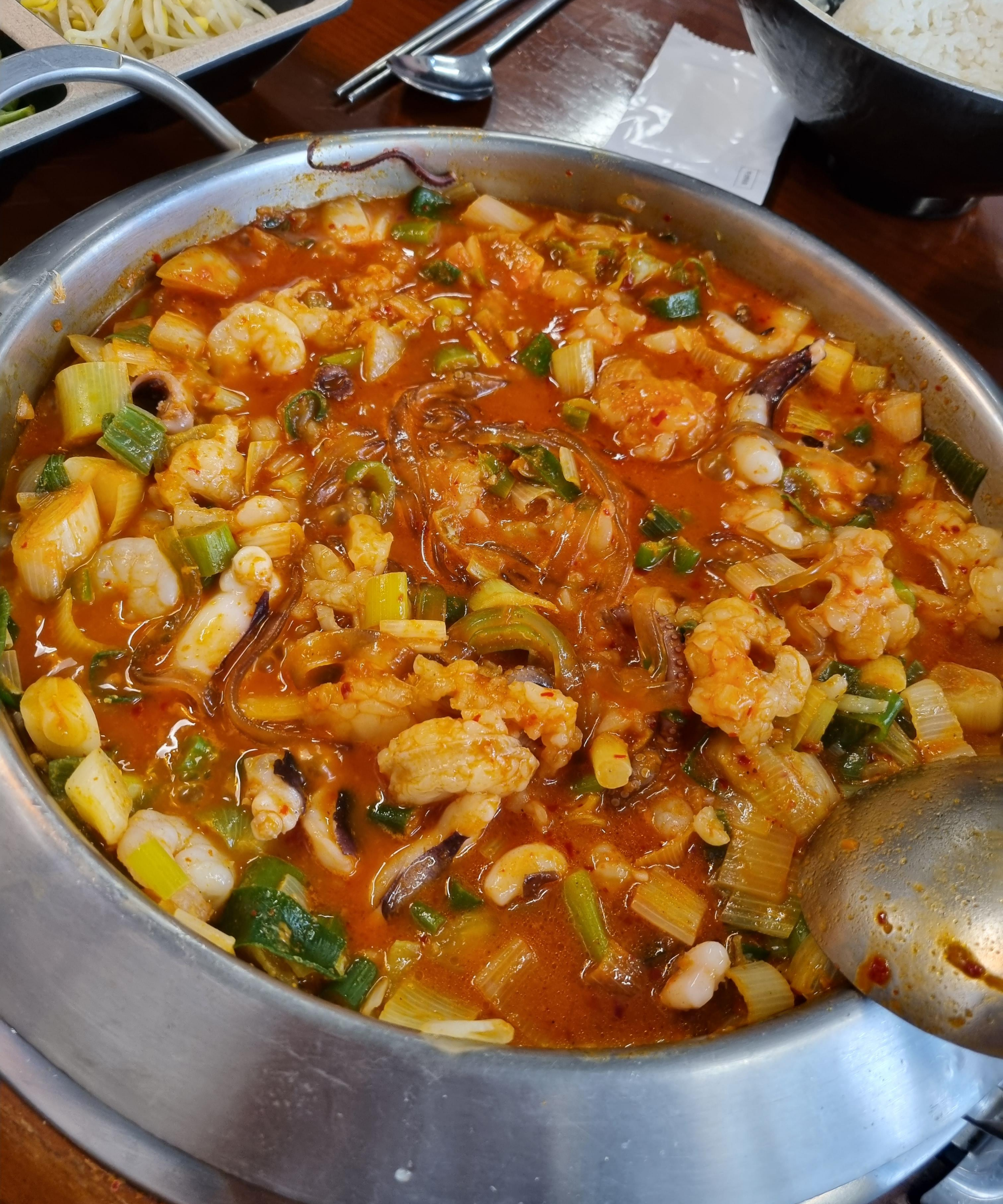 시간이 어느 정도 되면 직원이 냄비 뚜껑을 열어주기는 하는데, 냄비 가운데 재료들이 양념이 풀려 야아악간 붉어질 때 저어서 먹으라고 하더라. 실컷 젓고 좀 조리면 아래의 사진처럼 먹음직스러운 낙곱새가 된다!!