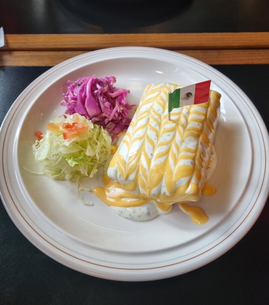 부리또 같은 건데 안에 치즈와 다진 고기가 들어가 있다. 바깥의 소스는.. 뭔지 모르겠음.ㅎ 마요네즈스러운 달콤 상큼한 소스다. 바깥에 소스가 듬뿍 뿌려져 있는데 부리또는 매우 바삭했다!! 개인적으로 제일 맛있었던 메뉴. 베스트인 이유가 있다.