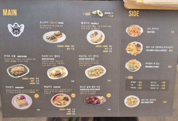 인기 메뉴는 1. 치미창가 2.엔칠라다 3. 멕시칸 블랙페퍼 치킨이다.