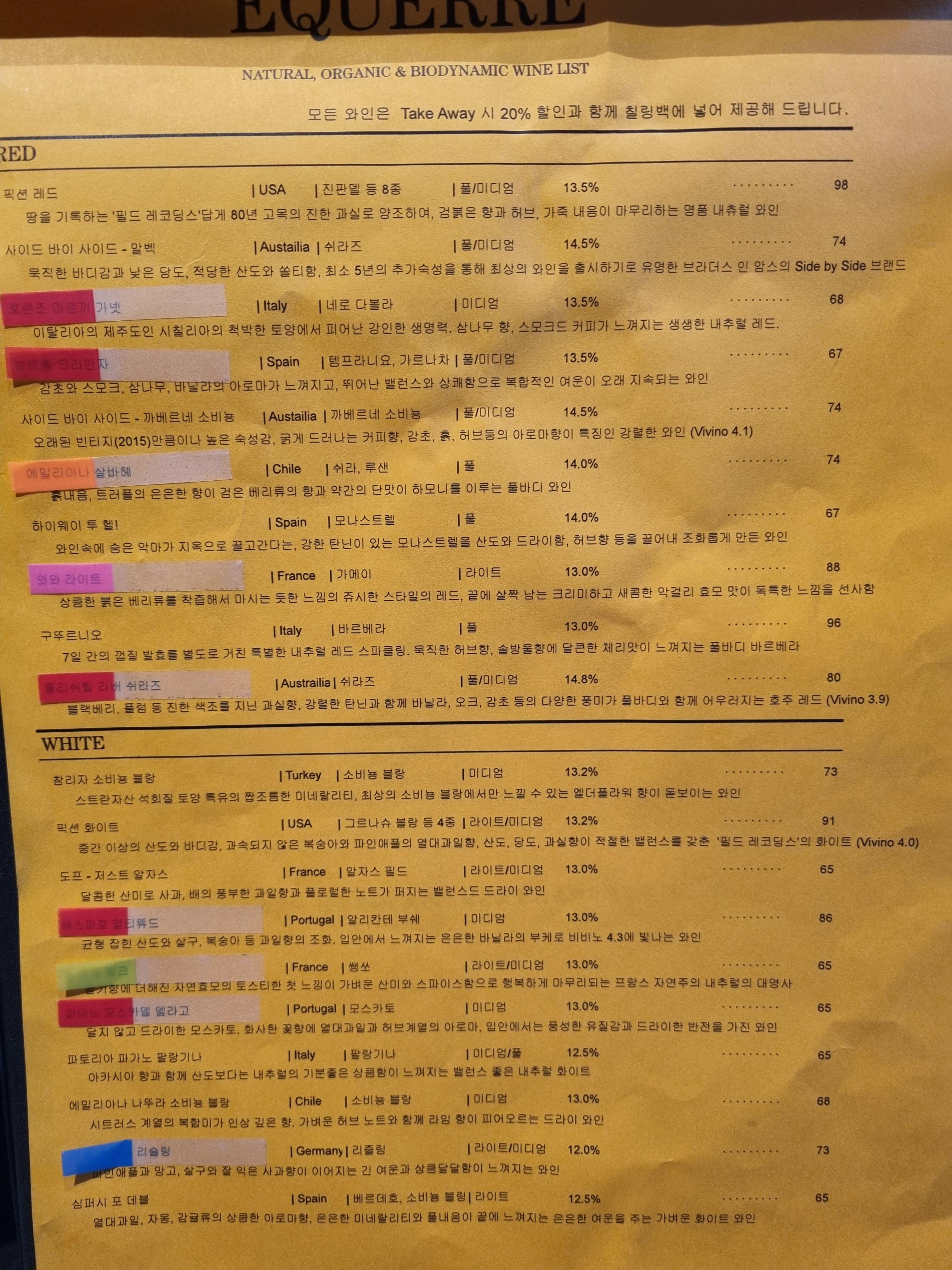 역시나 다양한 메뉴들. 레드, 화이트, 오렌지 등 다양하게 판매한다. 주로 보틀로 파는데, 글라스로도 파는지는 모르겠다.