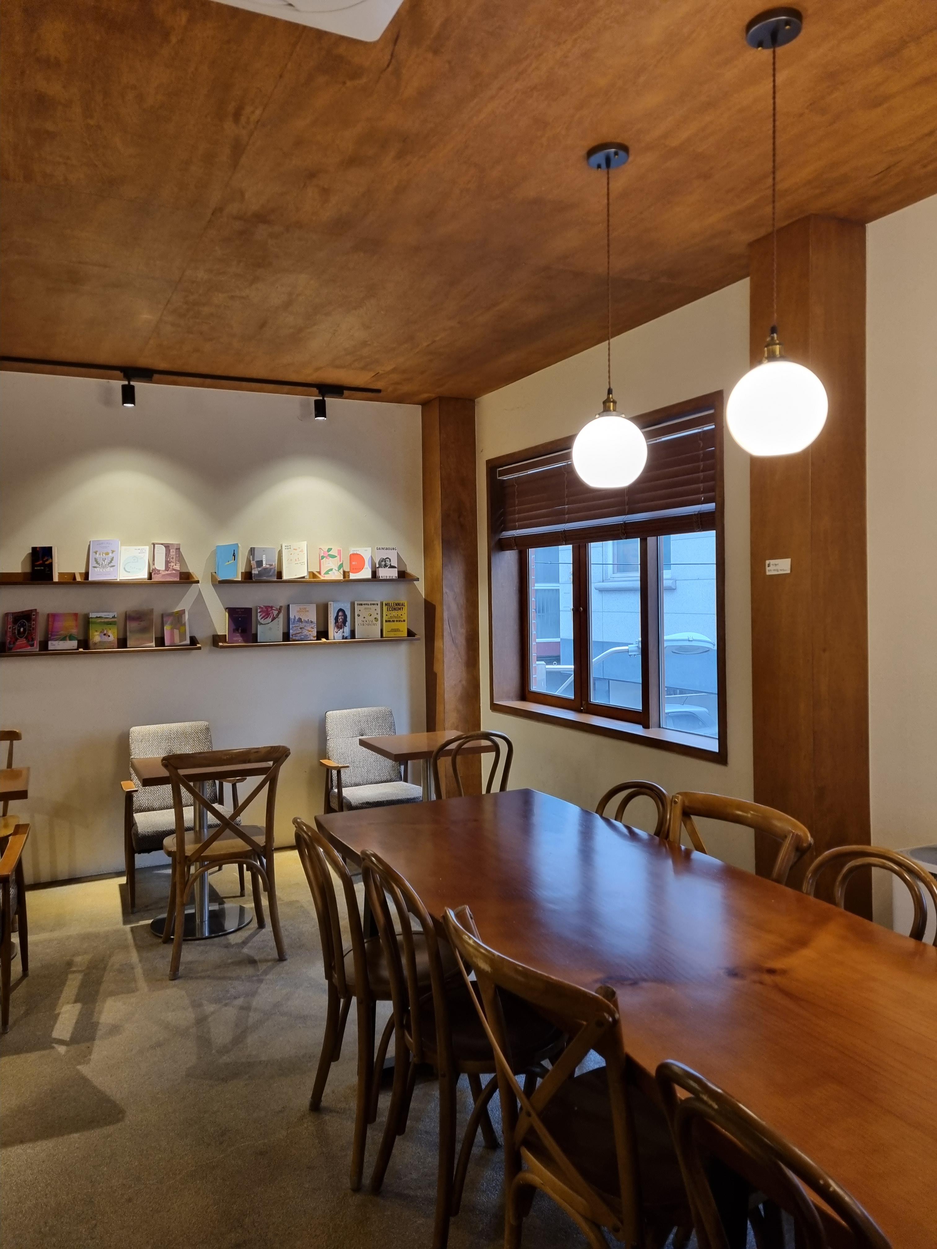 나무 인테리어에 널찍한 공간이 주는 차분한 공간도 마음에 들었는데, 읽을만한 책들도 많아서 더욱 좋았다.