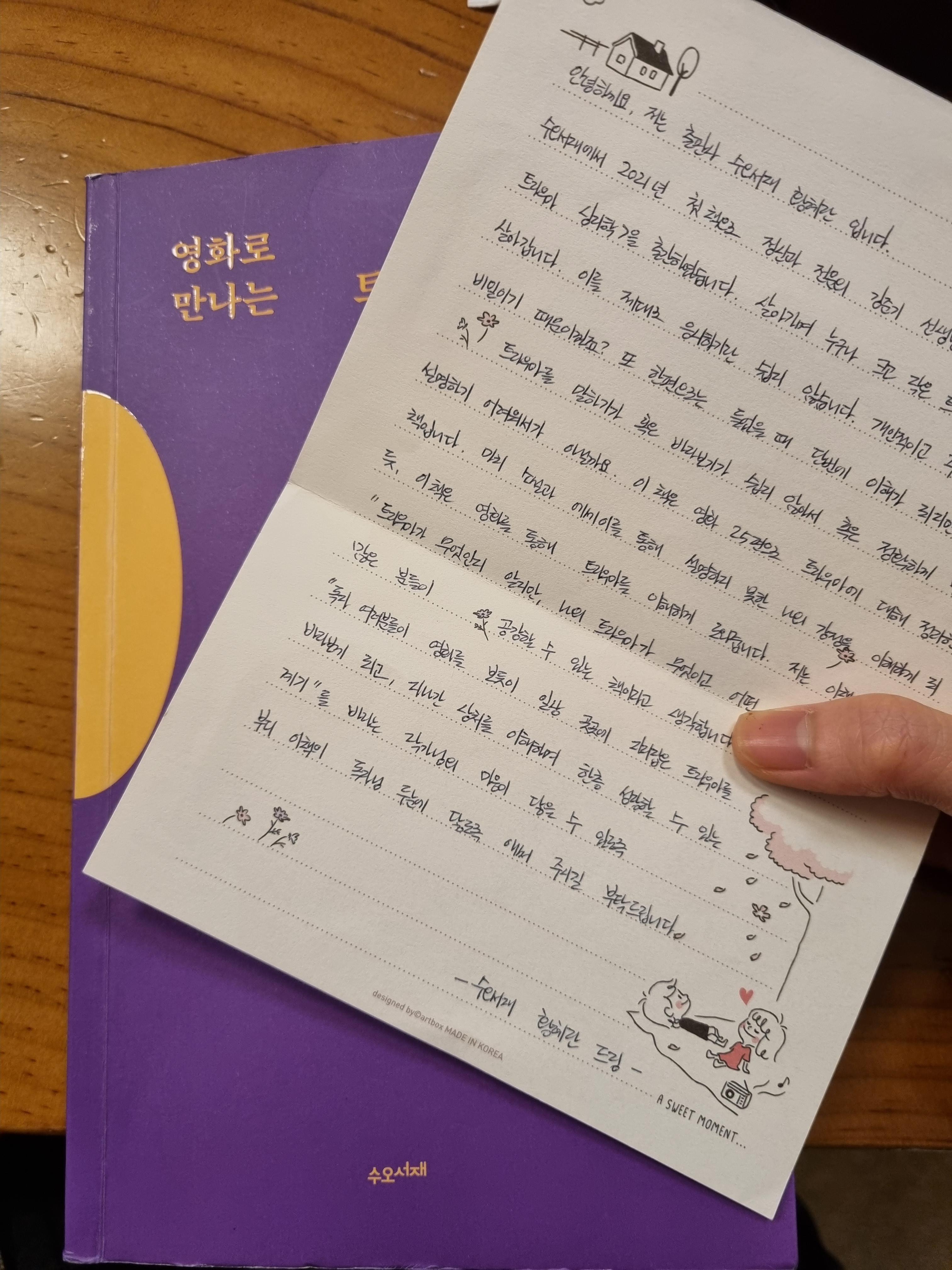 특이했던 점은 영화로 만나는 트라우마 심리학 앞에 종이가 있길래, 책을 기부한 사람이 이전에 썼던 독서 메모인가? 싶었다. 근데 웬걸! 해당 책을 출판한 출판사 수오서재 대표가 쓴 편지였다. 편지를 통해 책 출판의 의의와 가치를 느낄 수 있었다. 이런 뜻밖의 발견에 당인리책출판사에 대한 '독립서점'이라는 신뢰가 더 커졌다.