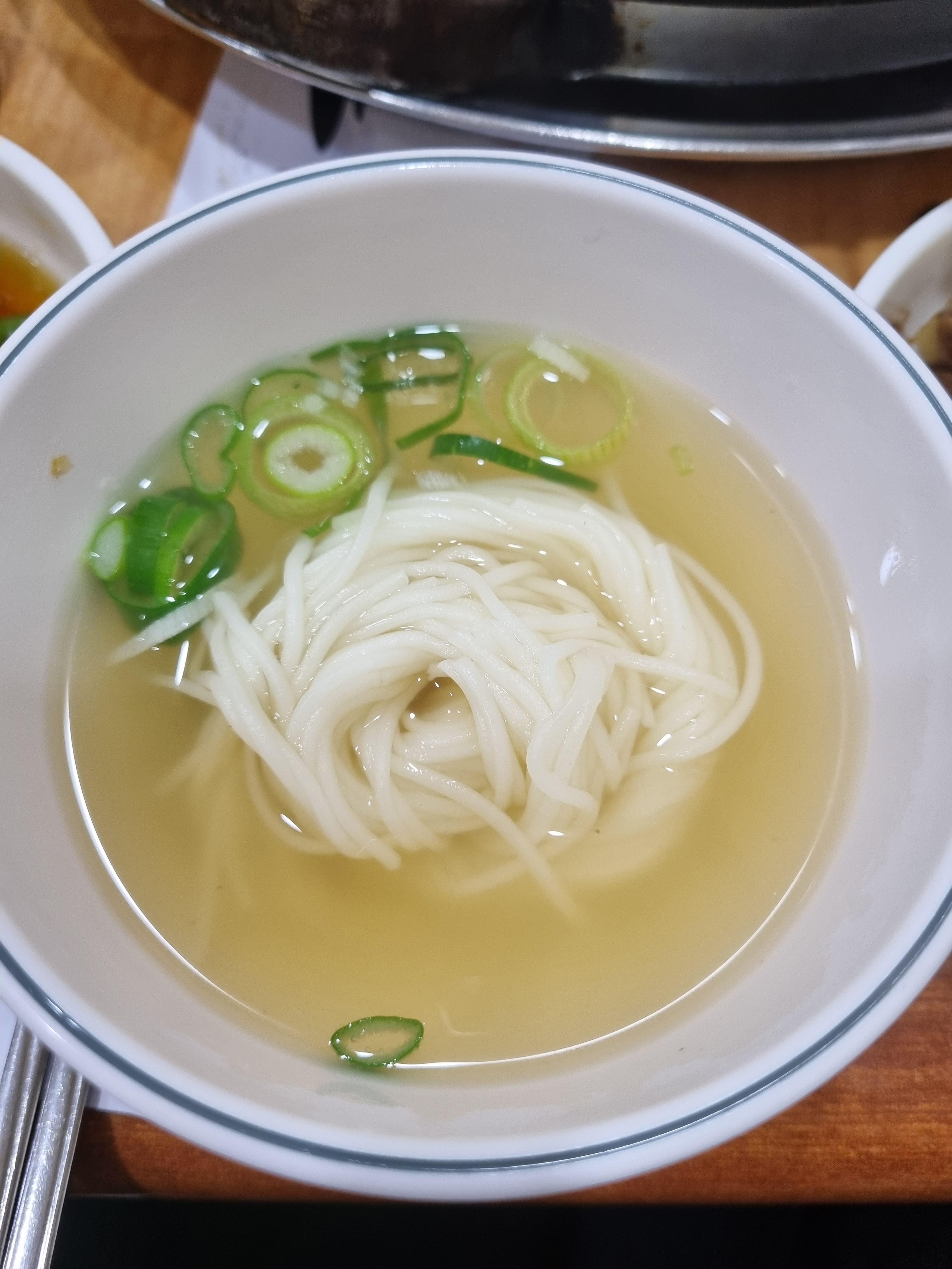 식사로 중간에 서비스로 국수도 주고, 기본 세팅된 부추가 들어간 간장 소스와 깍두기, 김치에 곁들여 먹으니 질리지 않고 계속 먹을 수 있었다. 딱 고오급 단체회식 메뉴의 정석 느낌이었다.