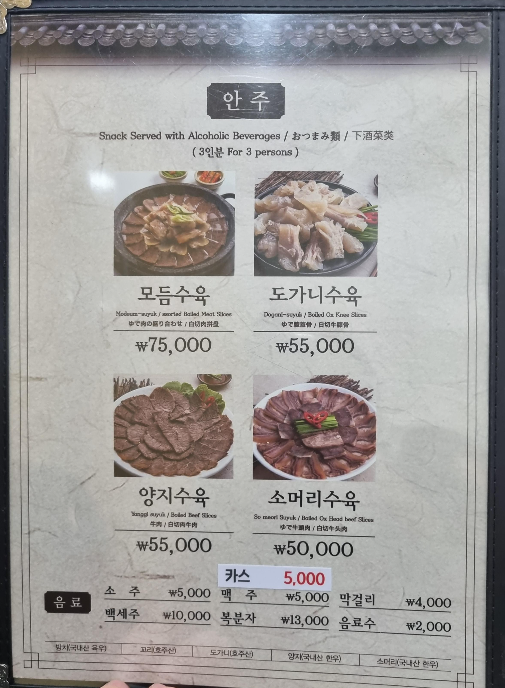 가격대는 좀 있는 편으로, 특히 안주의 경우 3인분에 7 ~ 12만원 선이다.