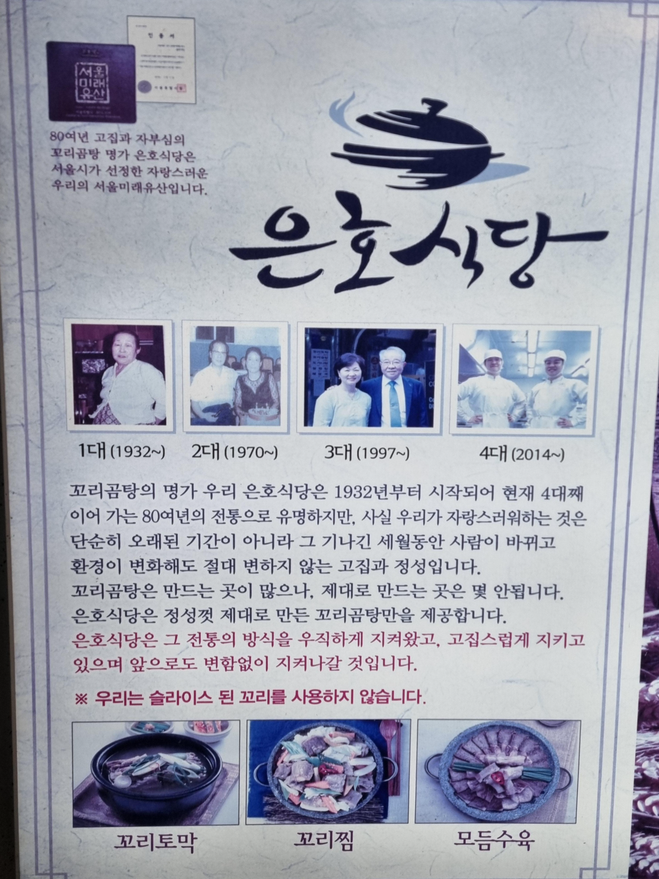 사장님의 얼굴까지 4대의 얼굴이 붙어있고 은호식당 꼬리곰탕 전문점으로서의 자부심이 나타나 있다.