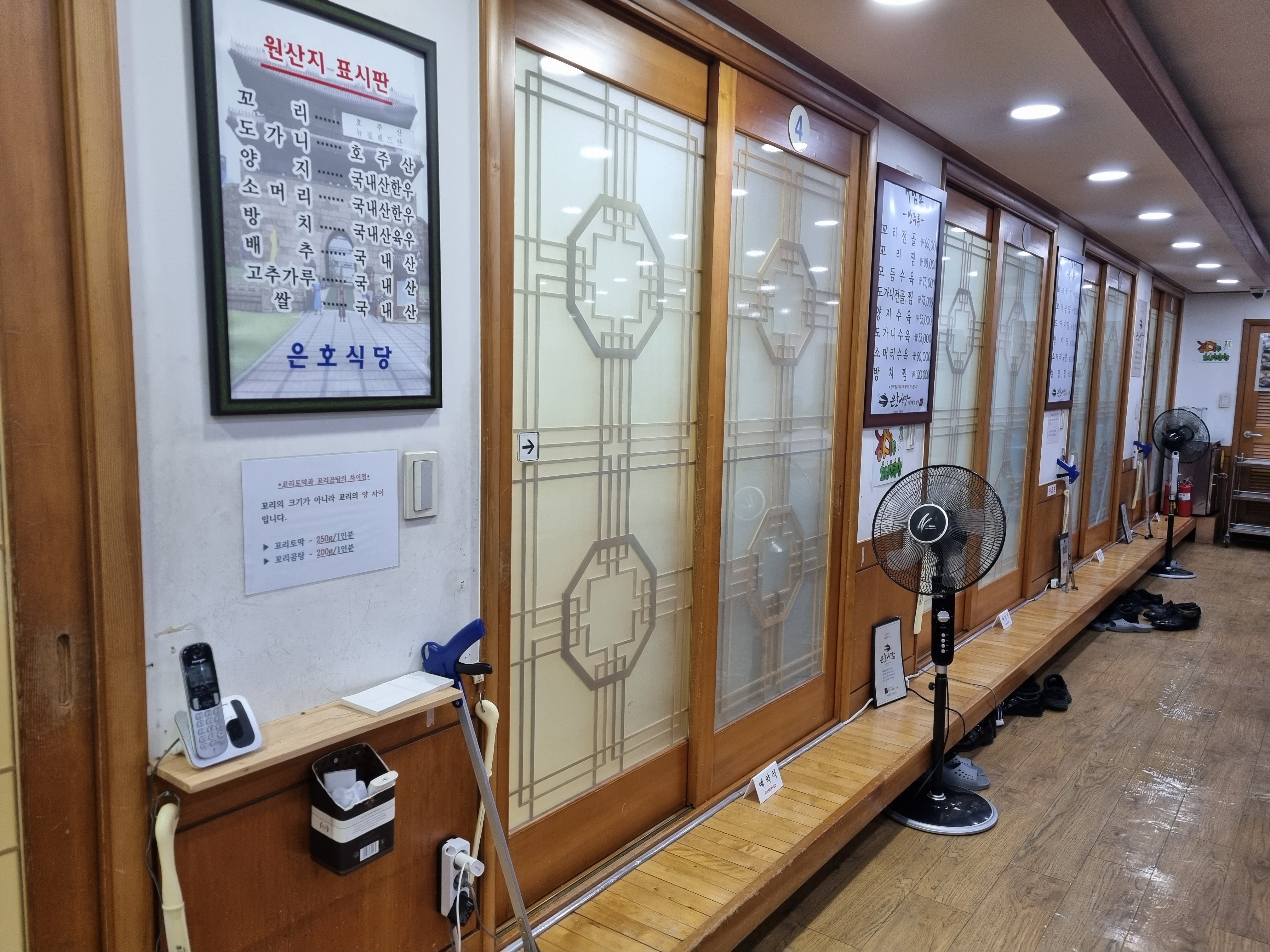 전통 문양의 미닫이 문에 룸이 4개 있는데, 각 룸은 8명 이상 수용할 수 있다.