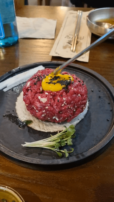 위에 올려진 계란 노른자를 살살 풀어 육회 비비기.