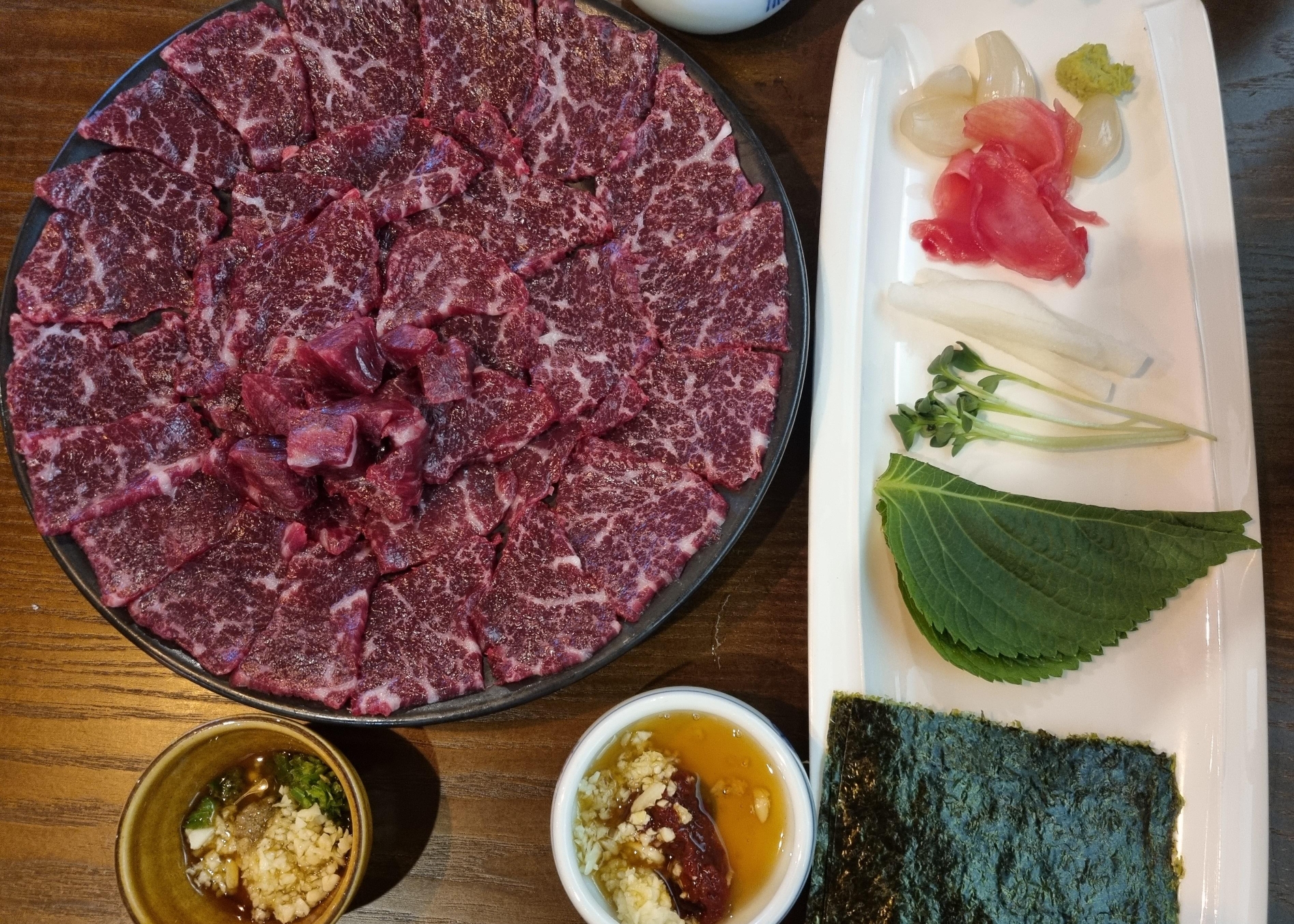 기본 세팅은 김, 깻잎, 무순, 무채, 생강과 와사비인데,