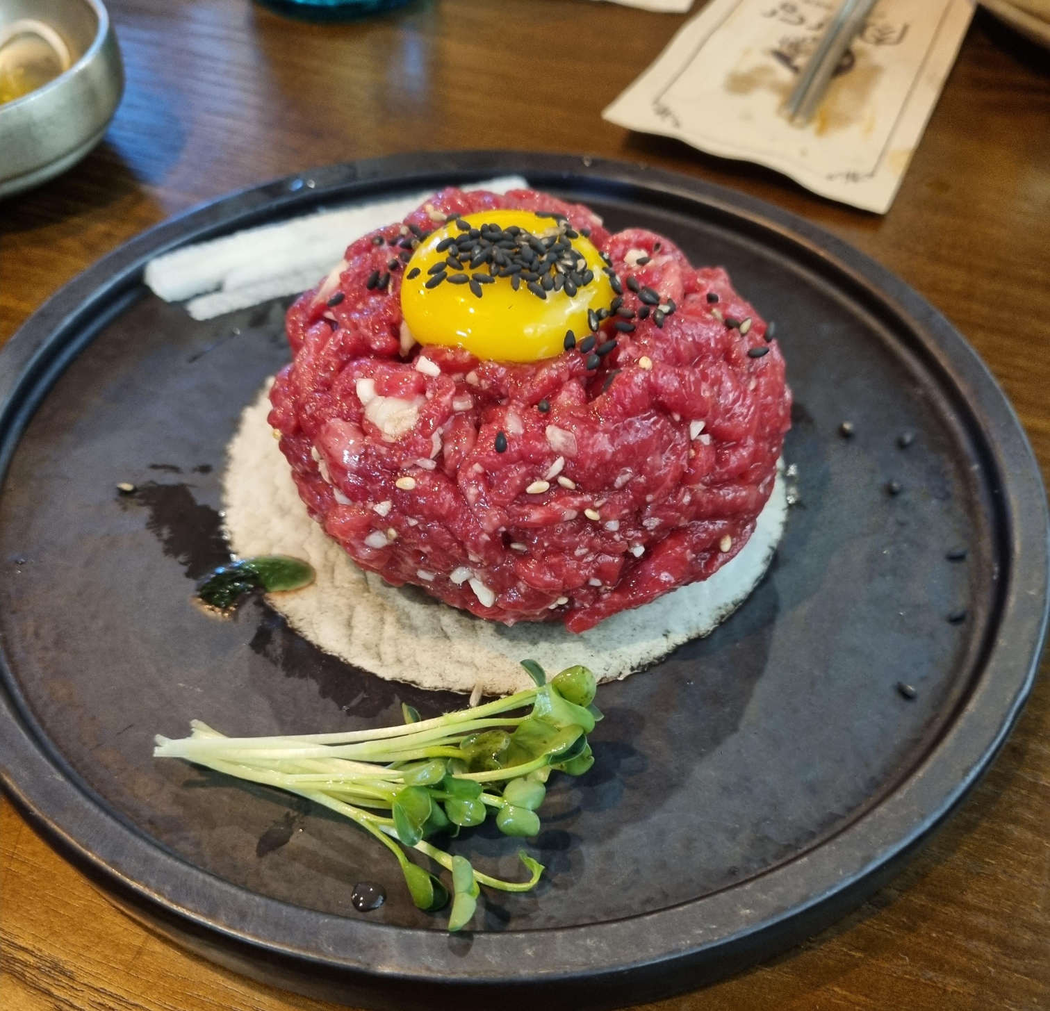 위에 올려진 계란 노른자를 살살 풀어 육회 비비기.