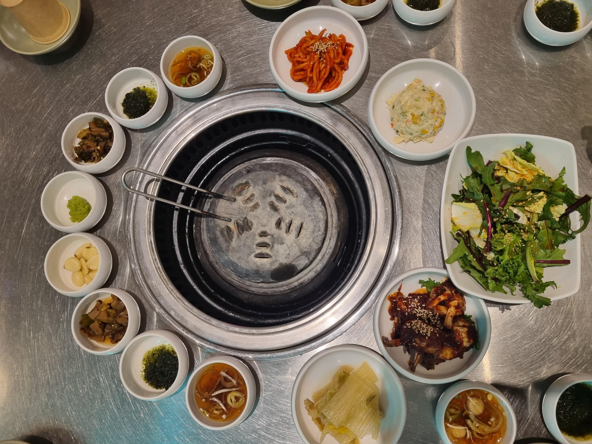 간장, 깻잎, 와사비 양념으로 고기 양념만 총 세 가지에 샐러드, 감자샐러드, 장아찌, 양념게장 등 밑반찬이 굉장하다!!