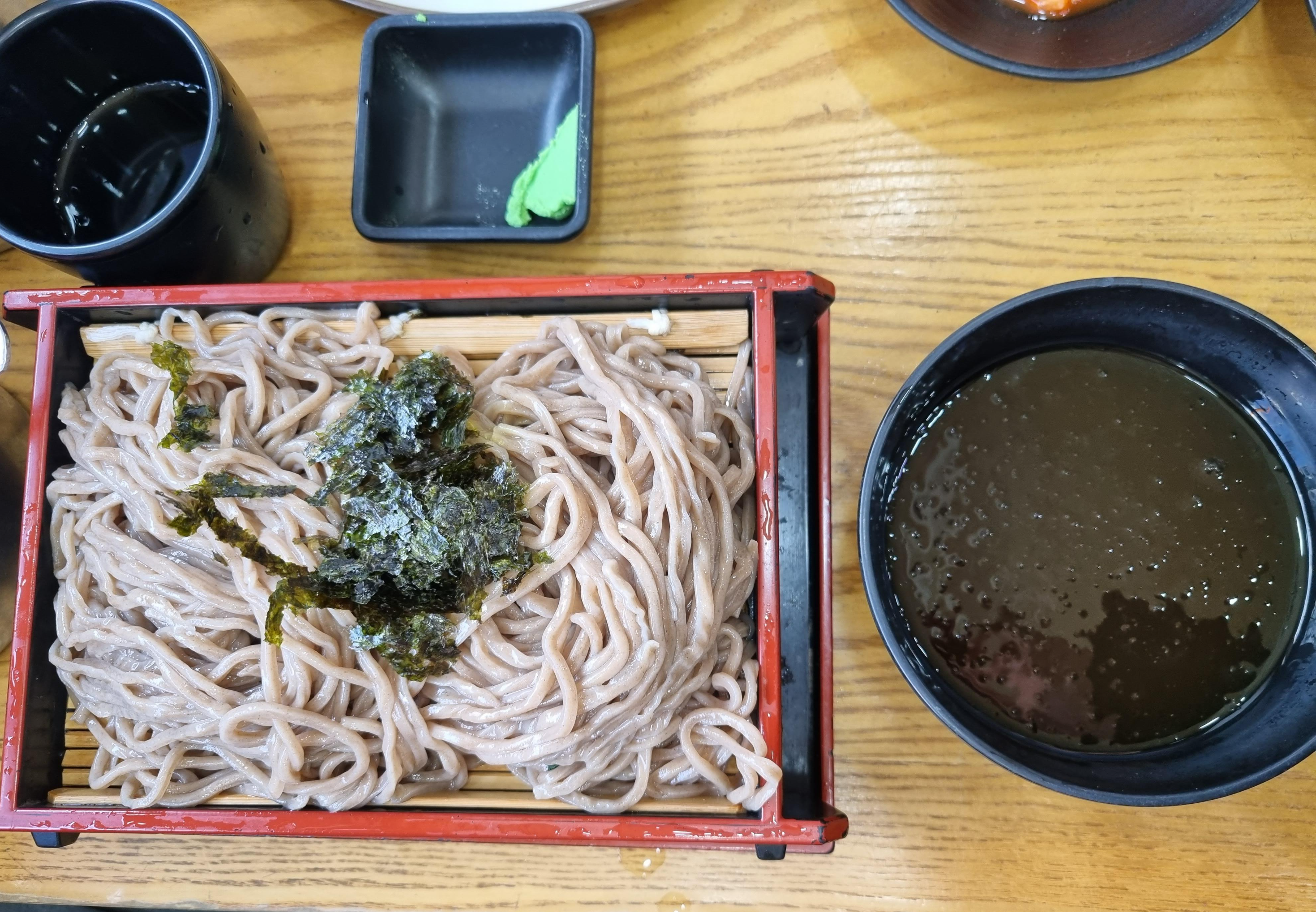살얼음이 있는 국물과 메밀면이 따로 나오고, 유부초밥 5개가 함께 나오는 메밀정식. 점심에 먹기 딱 적당한 양이다.