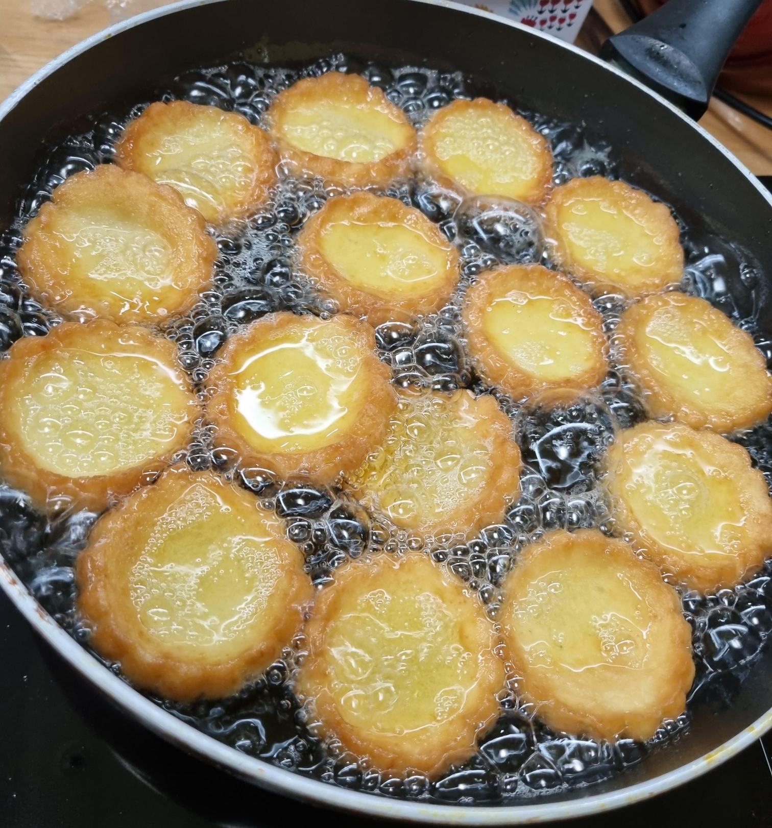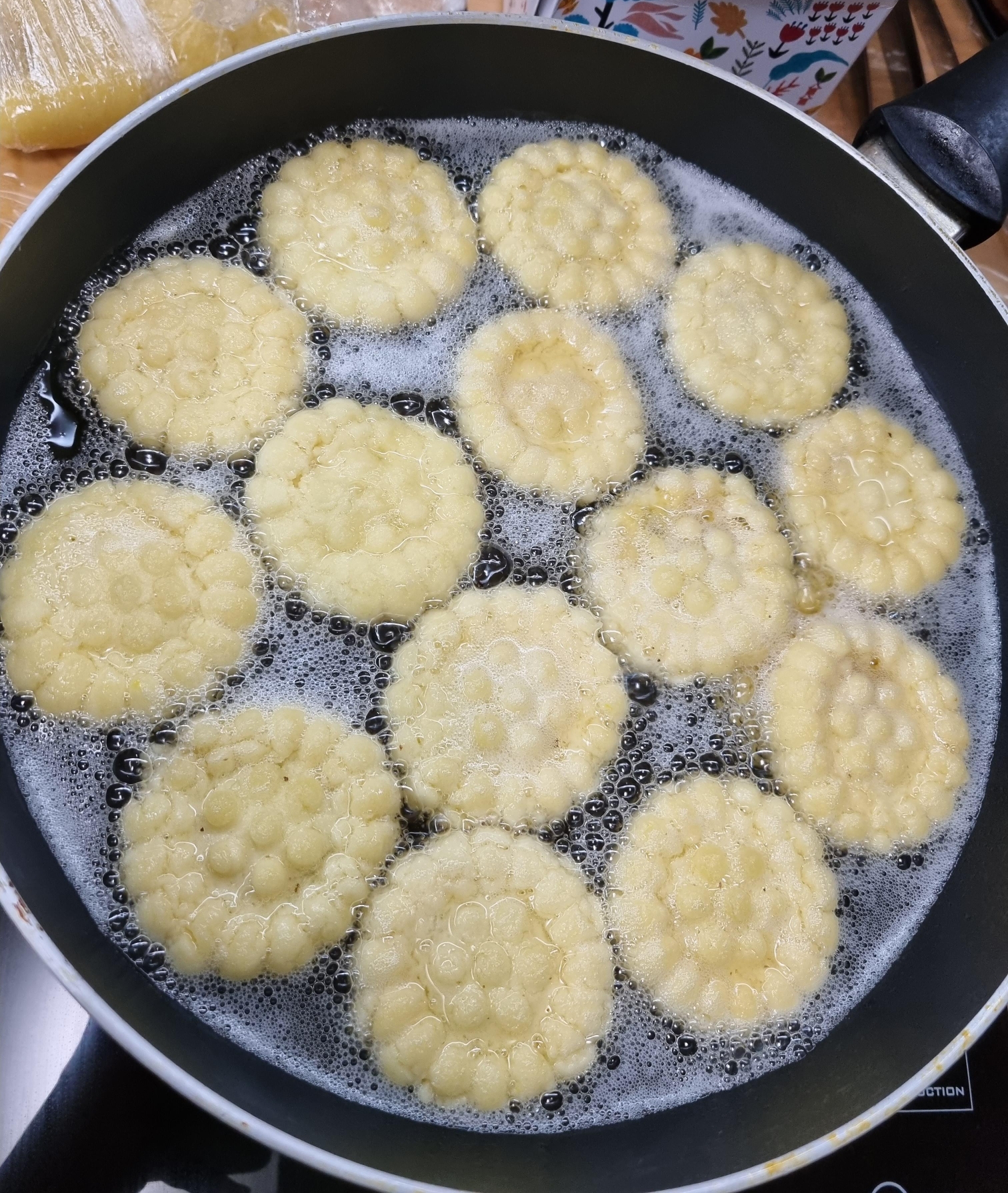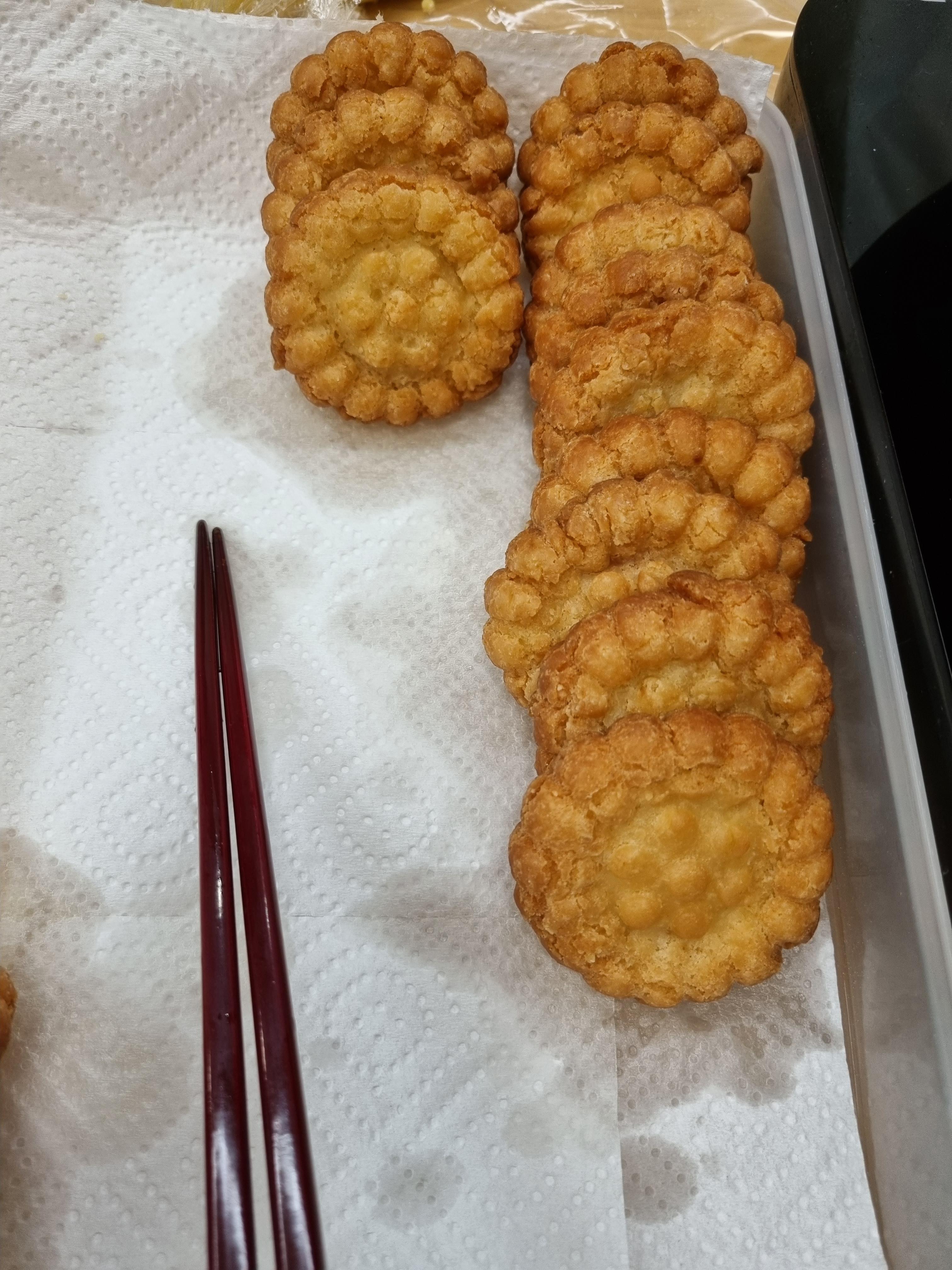 테두리를 잘 채우고, 가운데 부분을 좀 도톰하게 해야 약과를 튀기는 과정에서 약과가 찢어지거나, 가운데가 움푹 들어가지 않는다.