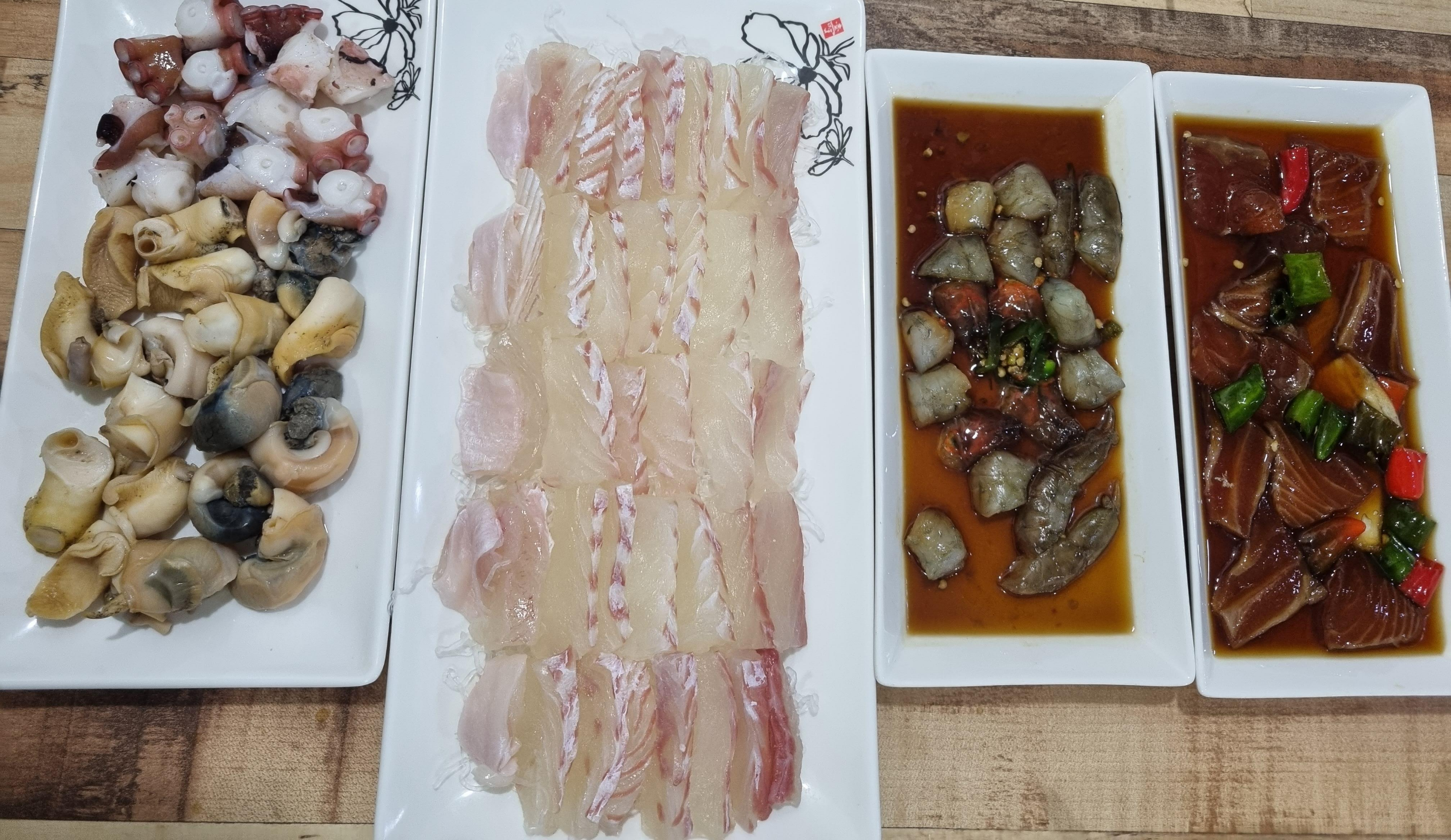 광어, 문어, 골뱅이, 조개탕으로 구성되어 있는데, 여기에 간장새우장이랑 연어장을 추가했다.
