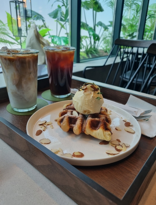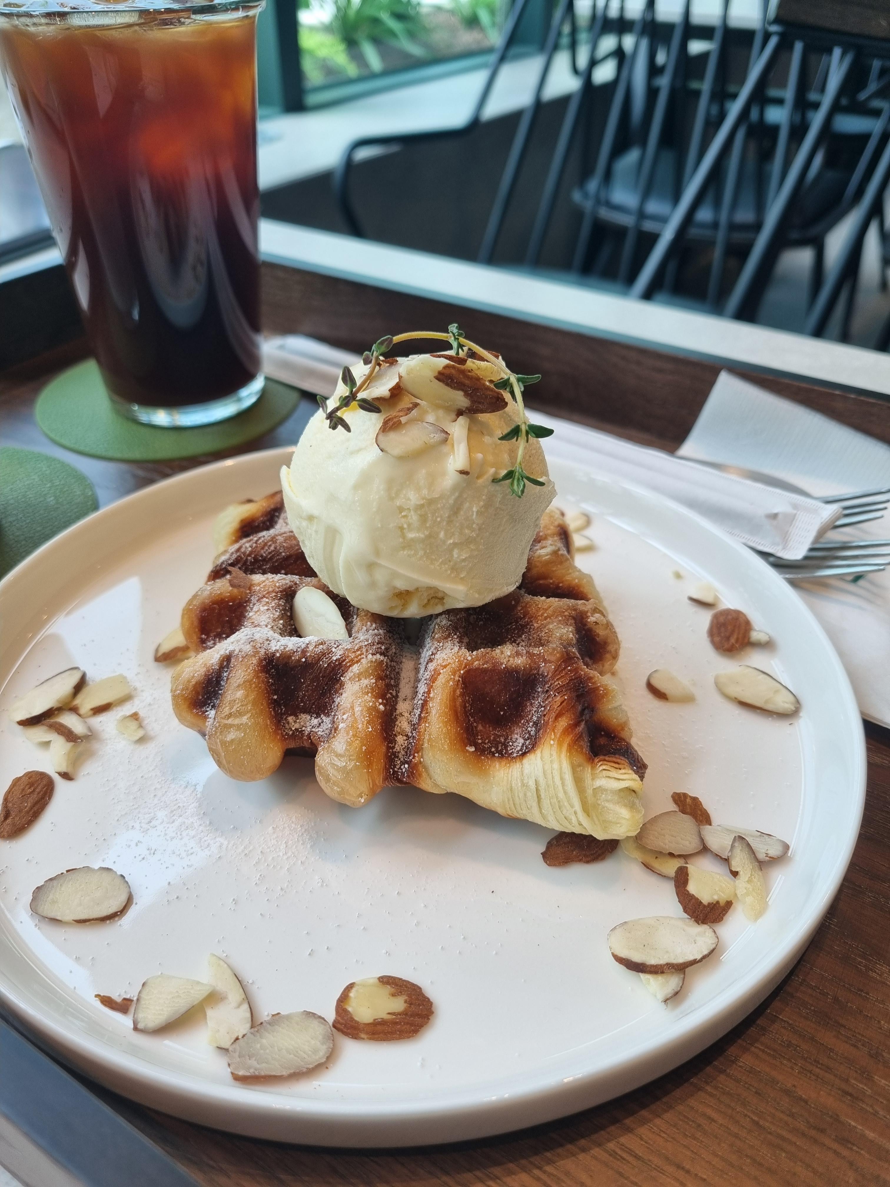 기본 크로플인데, 결대로 너무 부드럽고 겉은 바삭해 위의 바닐라 아이스크림과 찰떡궁합!