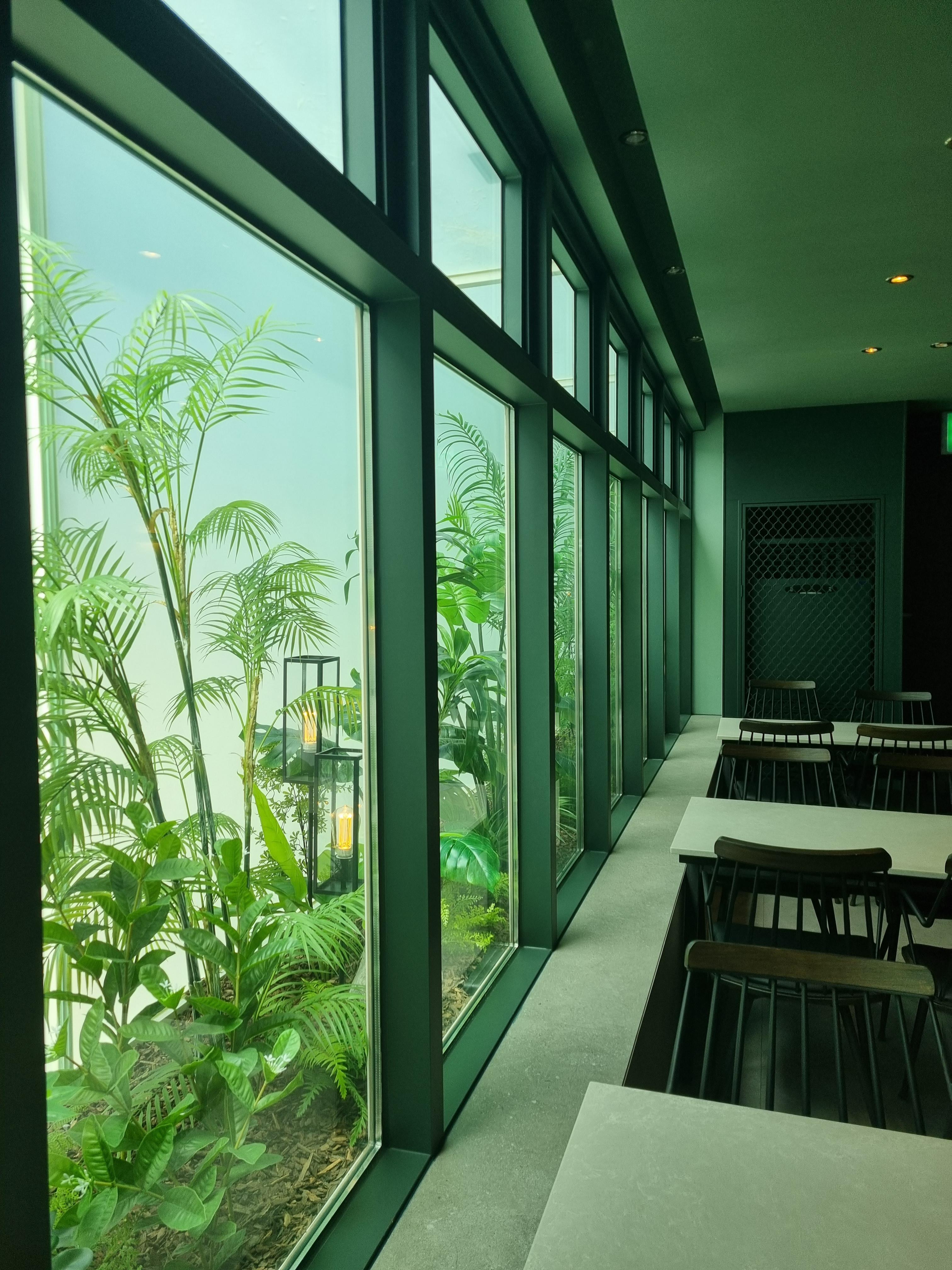 나무 종류도 다양하고 외부의 빛이 다 들어와 굉장히 밝고 차분한 분위기를 내는 창가 쪽 자리.