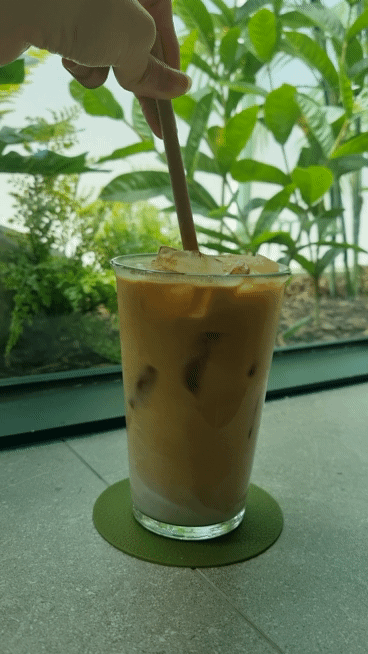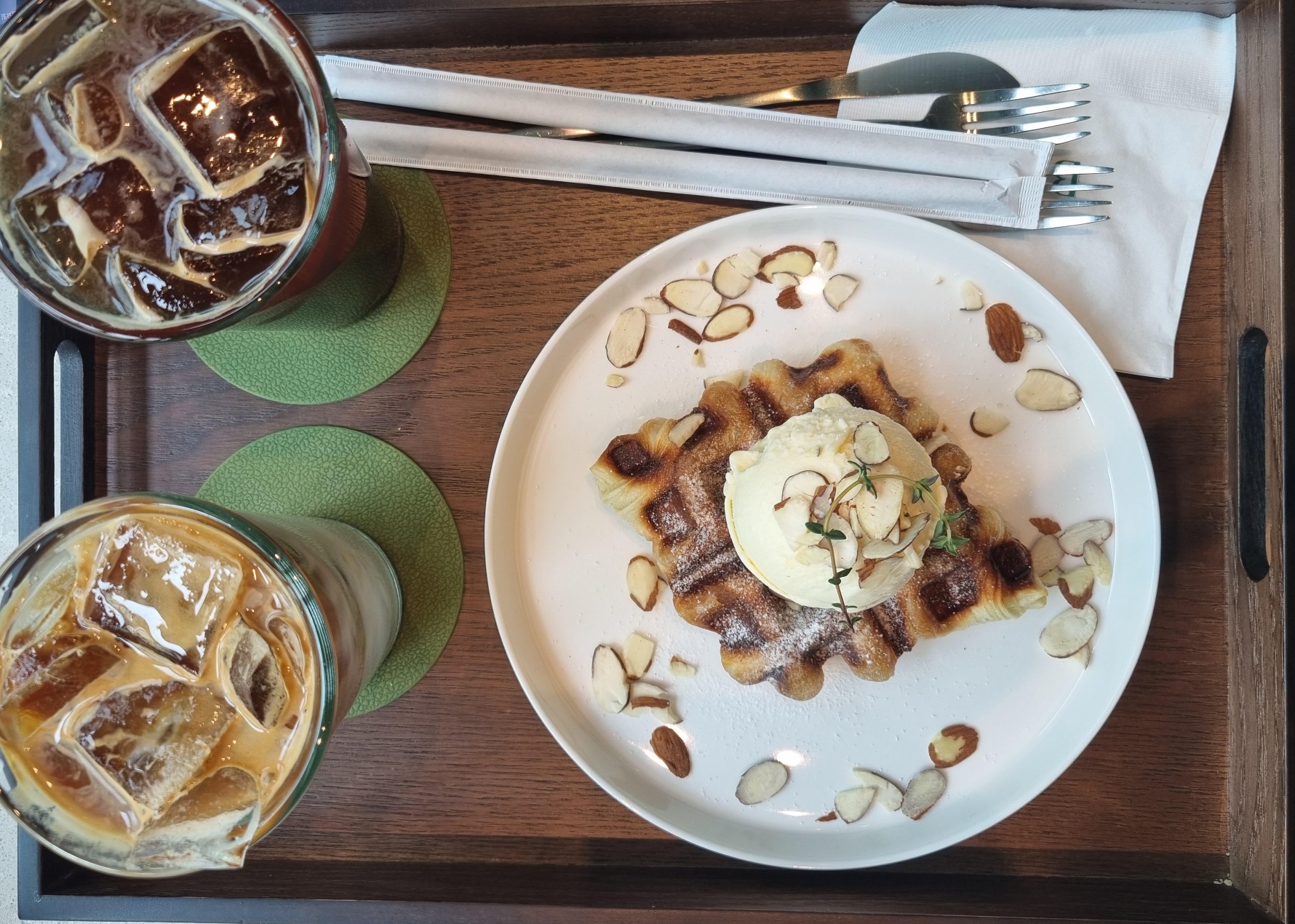 음료도 적당한 양으로 초록 코스터에 같이 나와 예뻤다.