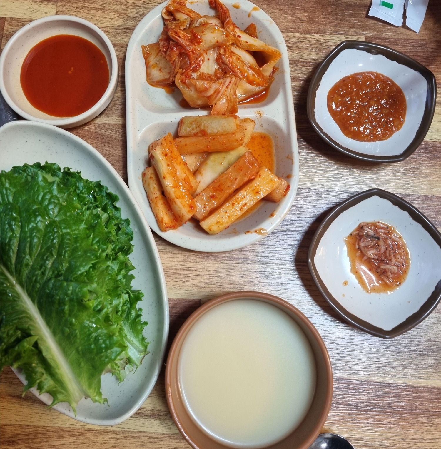 같이 나오는 무절임과 쌈채소, 마늘, 깍두기, 김치 등과 함께 먹으면 풍족하게 먹을 수 있다.
