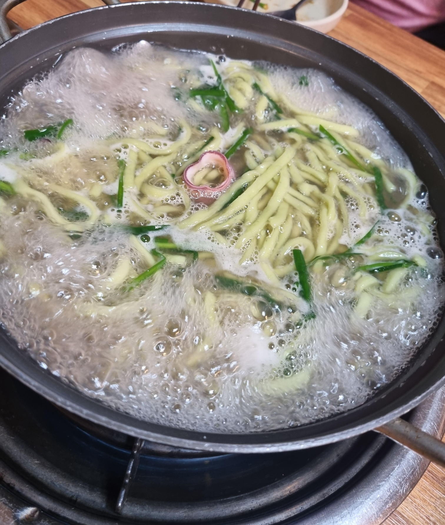 부추가 들어가 약간 초록빛을 띄는 칼국수면에
