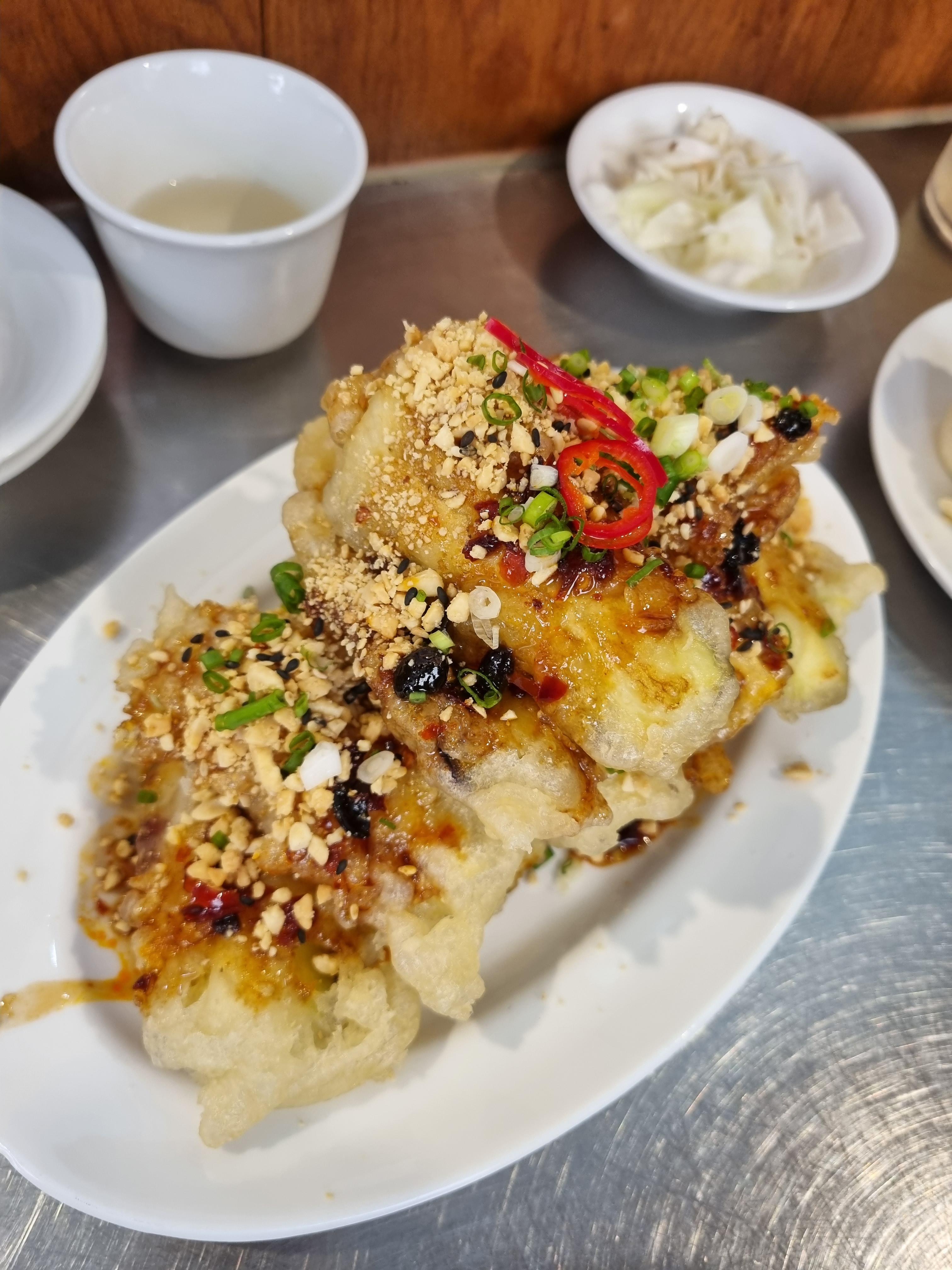 갓 만들어져 바삭한 튀김과 뜨끈한 가지.
