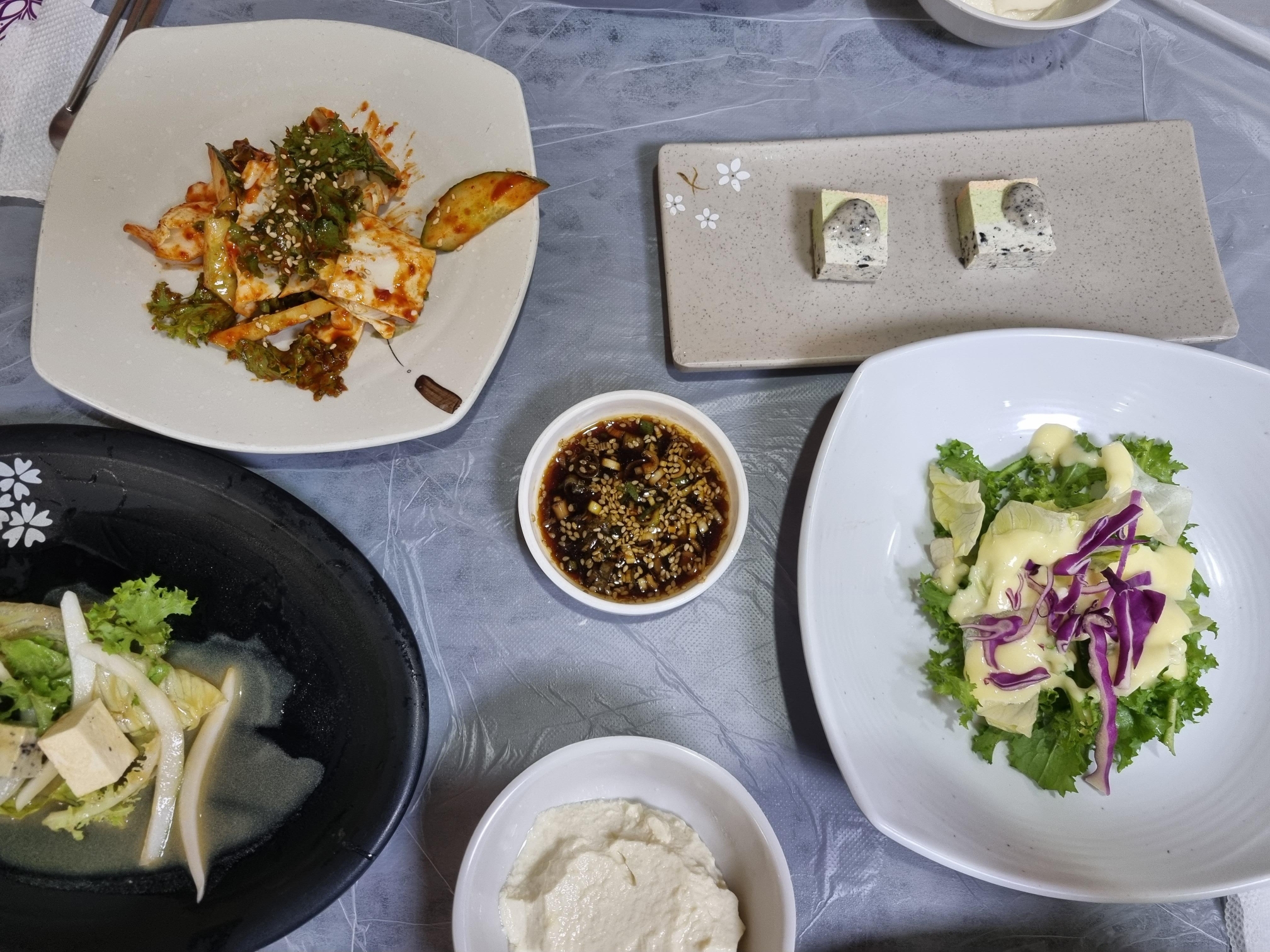 두부가 들어간 샐러드.. 참깨 드레싱이 올라간 색두부, 연두부는 에피타이저...