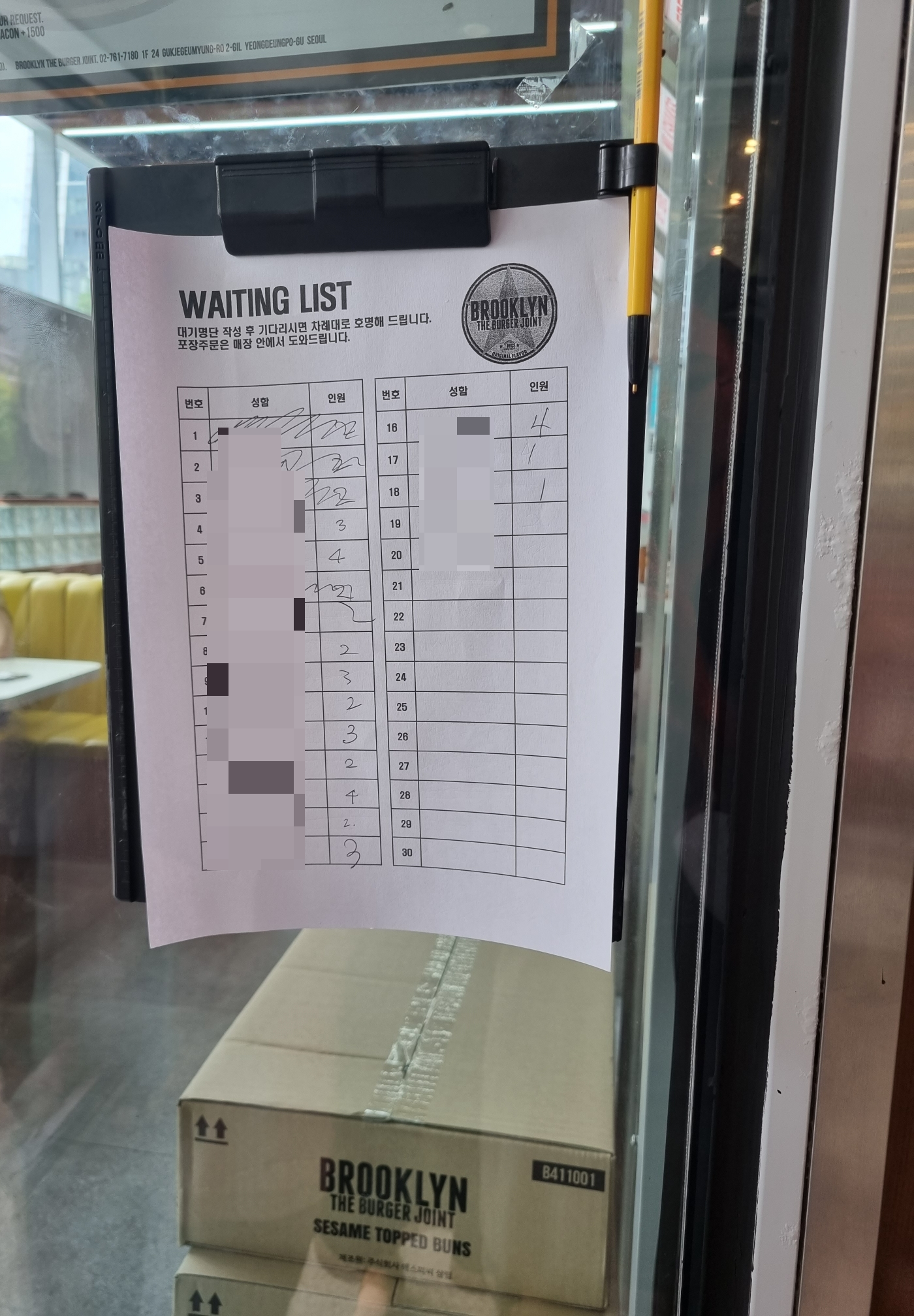 브루클린더버거조인트 웨이팅은 문 앞에 있는 웨이팅 리스트에 이름과 인원수를 작성하면 된다.