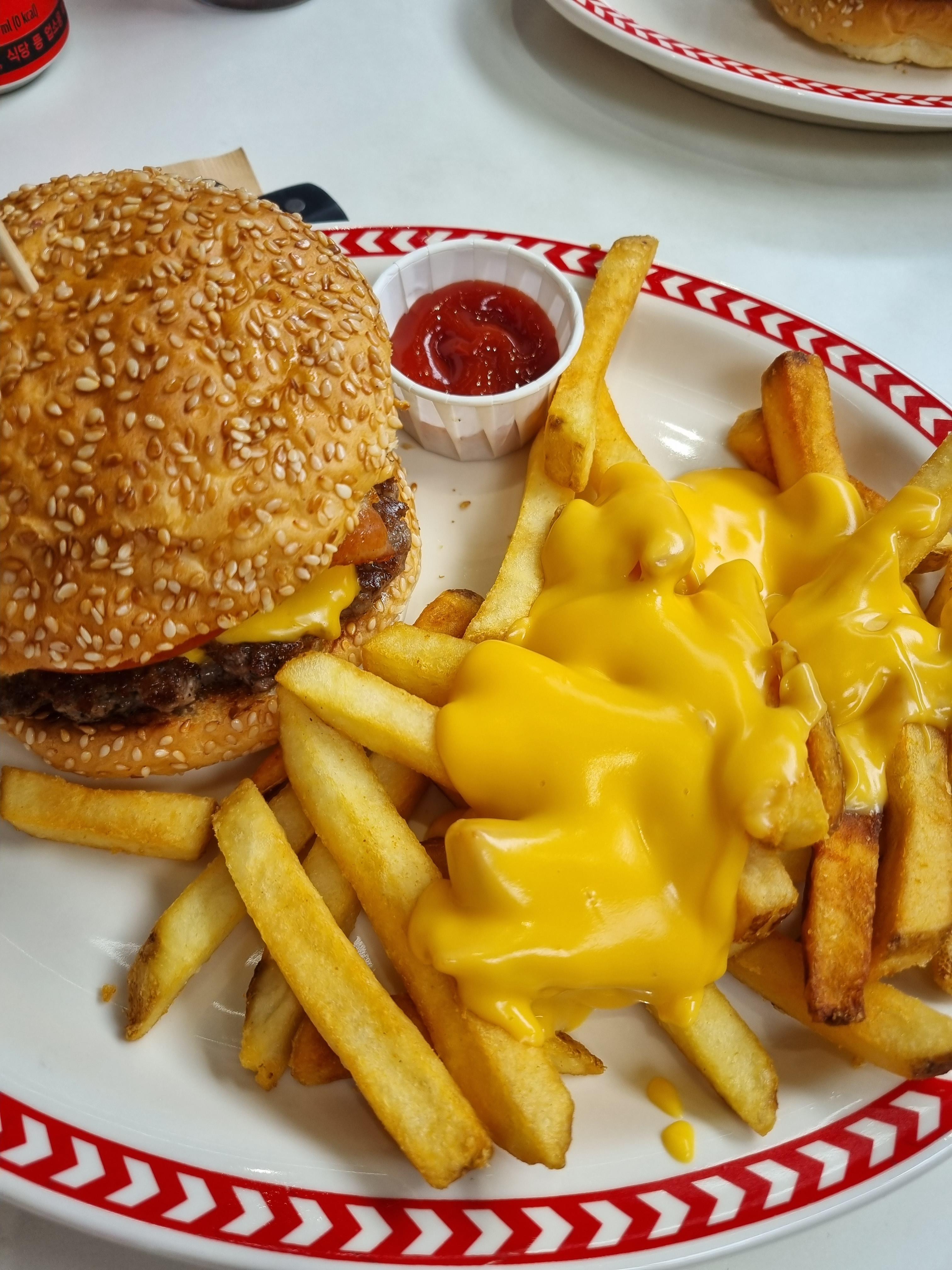 패티와 치즈, 베이컨이 들어간 짭조름한 버거에 치즈프라이 세트 주문!!