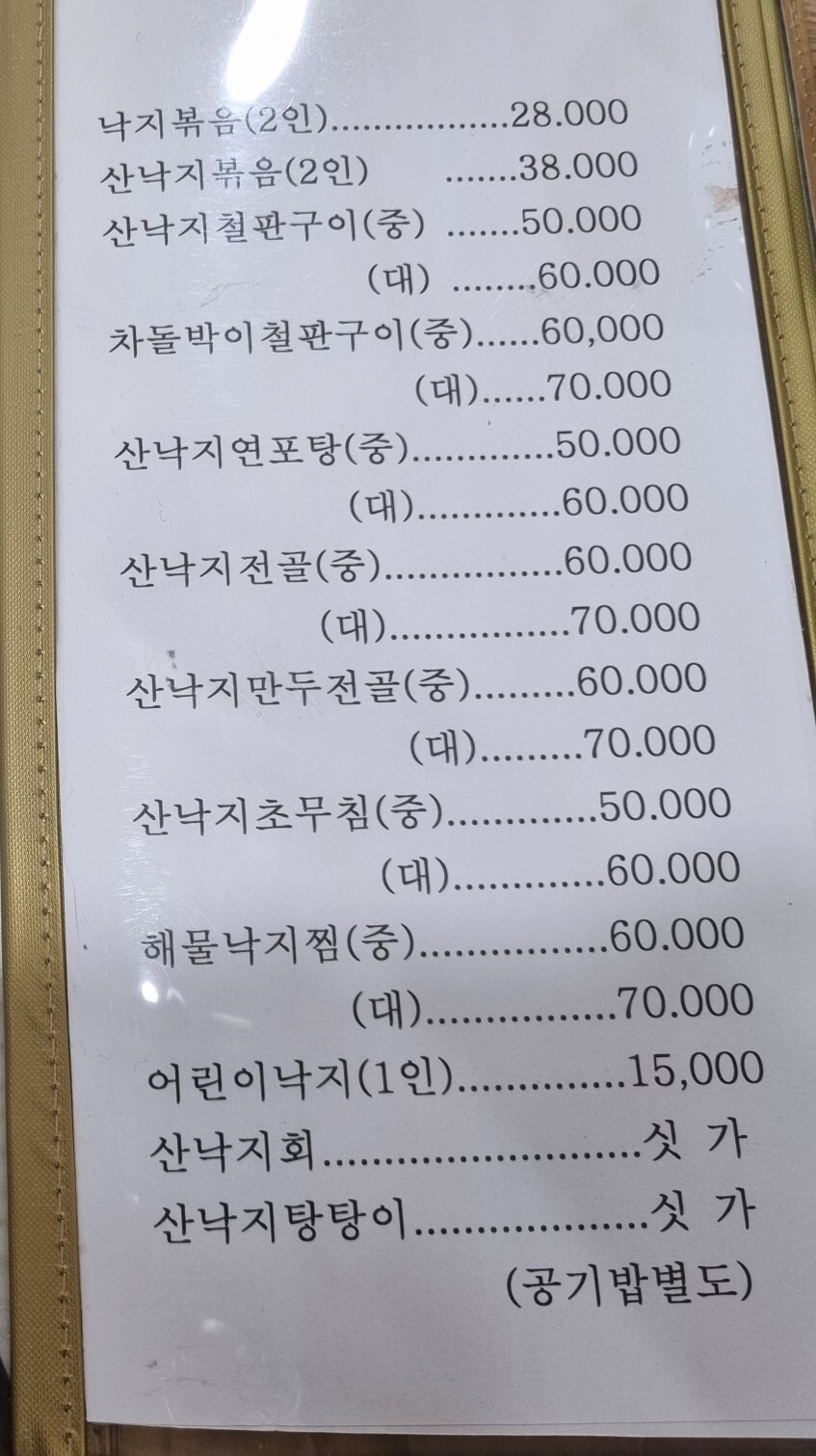 낙지볶음, 산낙지볶음, 산낙지철판구이, 연포탕, 낙지만두전골 등등... 안 파는 게 없다.