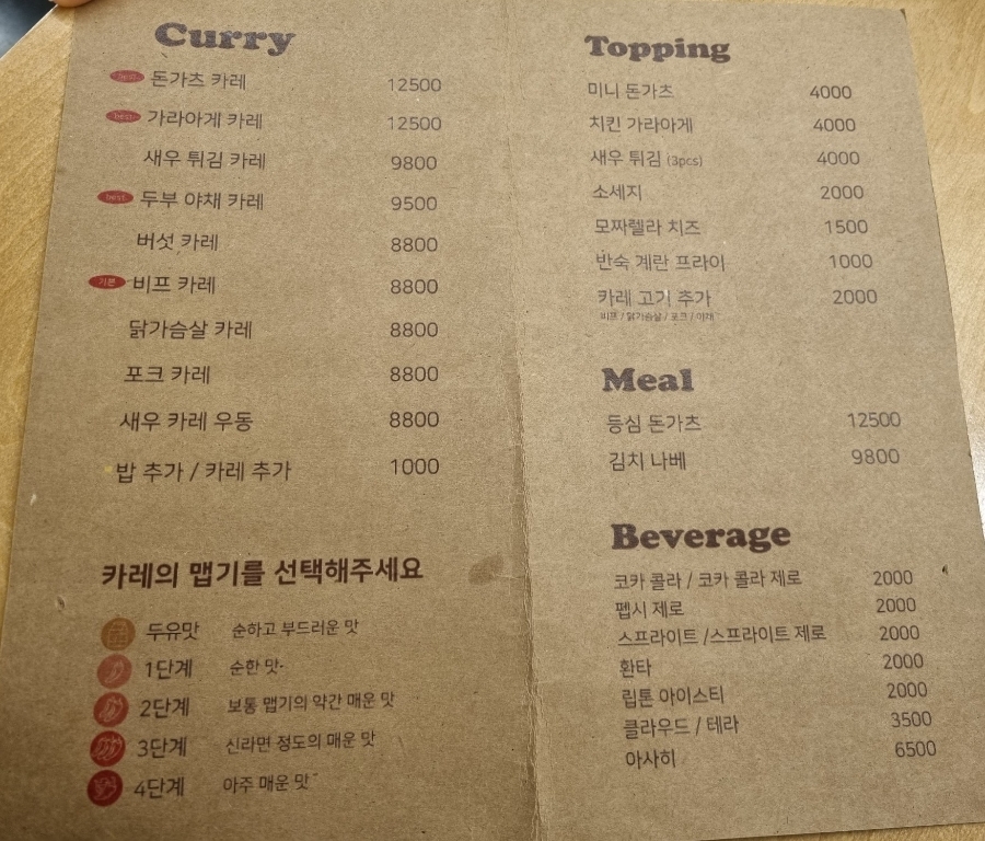 오목교 맛집 쿠마카레는 카페와 함께 먹을 토핑+카레의 맵기 정도를 선택하게 된다.