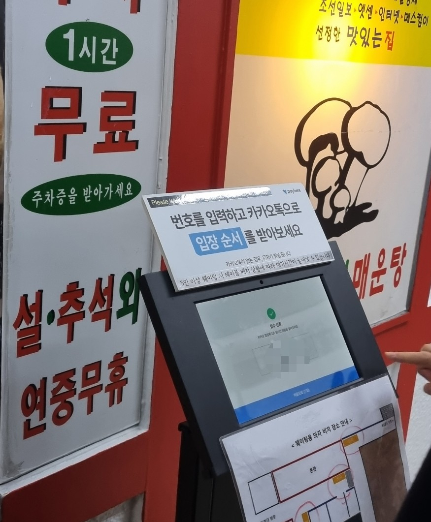 여의도 칼국수 가양칼국수버섯매운탕 웨이팅은 문 앞에 있는 기계에 핸드폰 번호와 인원을 작성하고 걸어두면 된다.