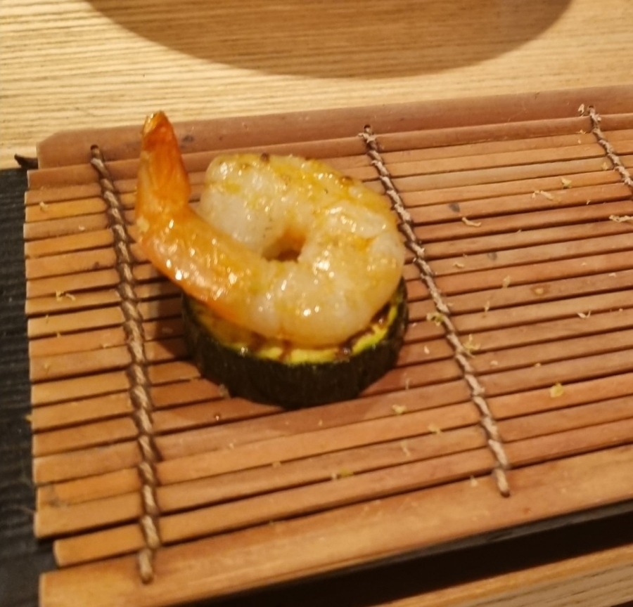 : 가지와 함께 주는데 새우 먼저 먹고 가지 먹으면 된다.