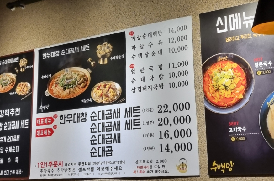 한우대창 순대곱새 세트 22,000원, 순대국밥 10,000원