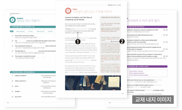 Reading의 경우, Reading의 구성은 크게 기사 전면(하단에 단어), 빈칸과 우측의 해석, 몇 가지 Quiz, Writing으로 구성된다. 교재에서 추천하는 공부법은 1. 기사 정독 2. 해석을 보며 빈칸 채우기 3. 인터넷 강의 듣기 4. Quiz 및 Writing exercise 하기이다.