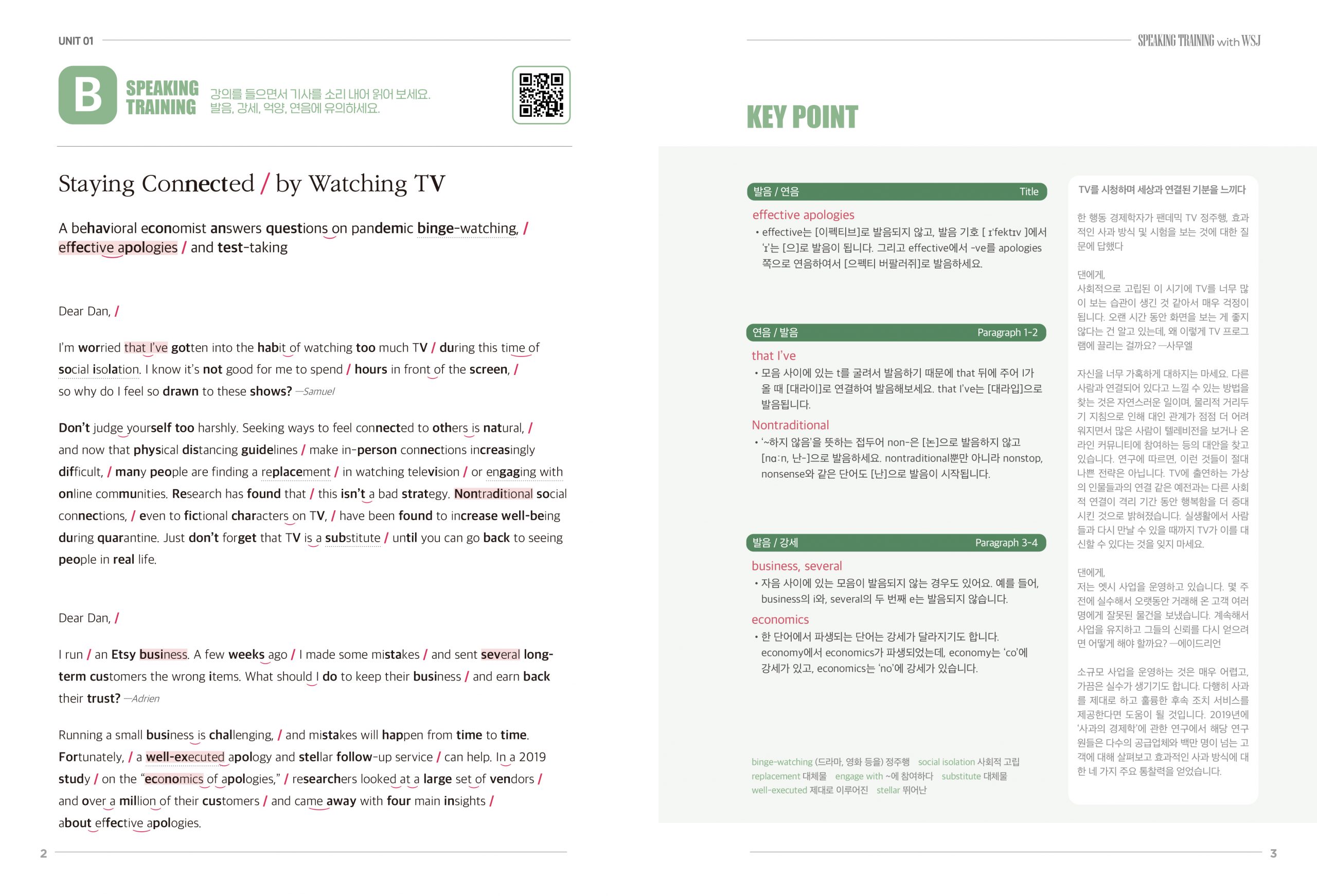 Speaking의 경우는 연음, 끊어읽기, 강세를 각각 이음 표시, 슬래시, 굵은 글씨체로 표시해주어 유의해 읽을 수 있다.