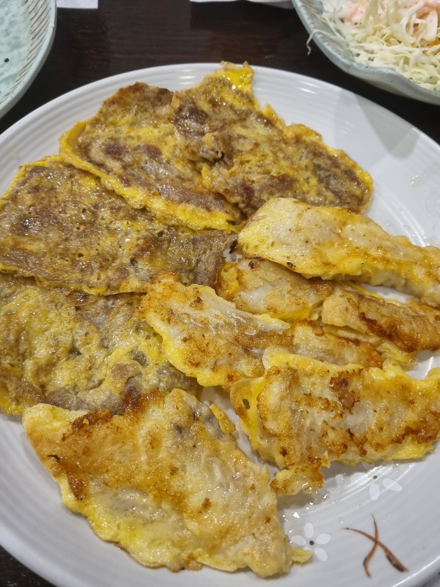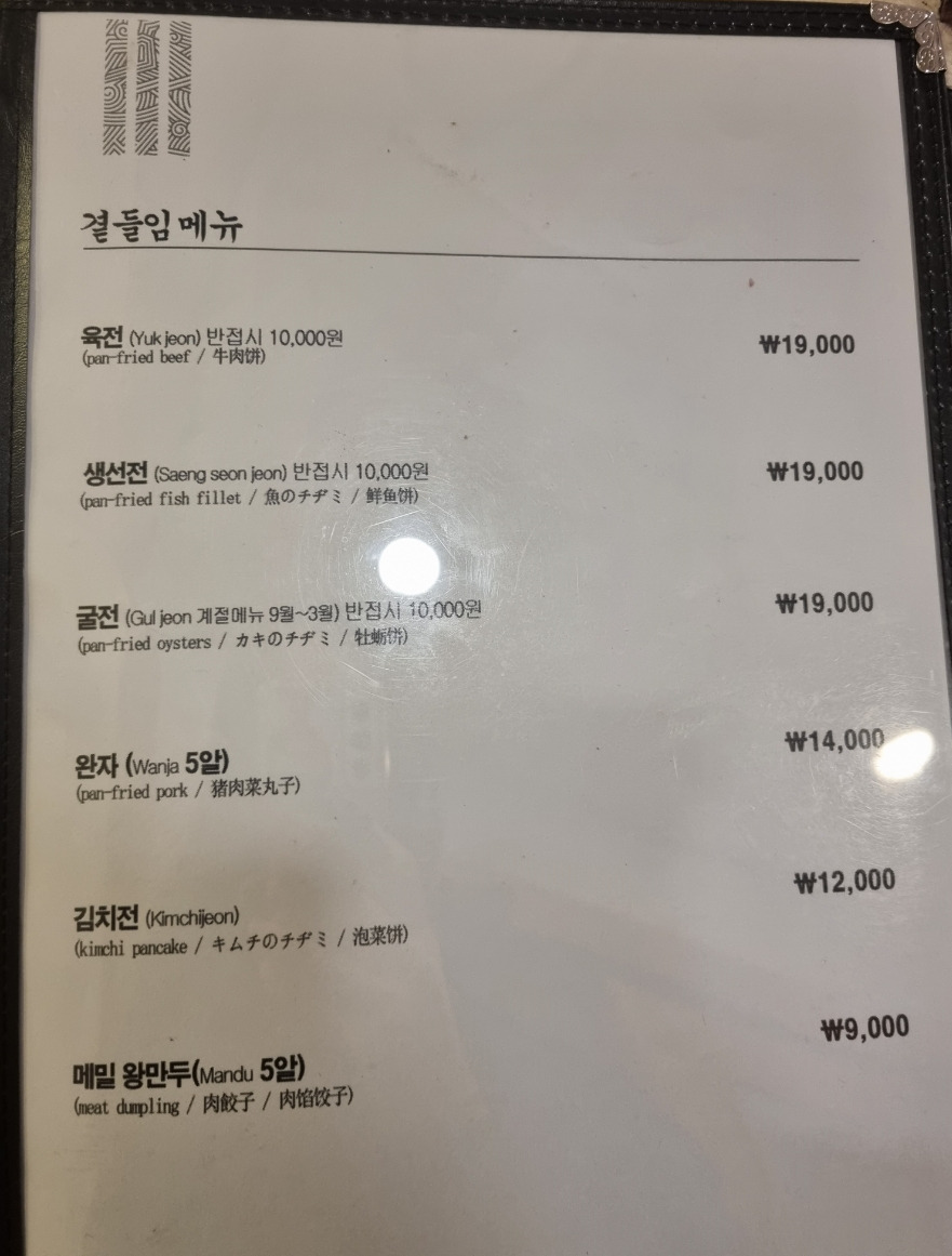 - 얇게 부쳐진 생선전과 육전, 달달한 간장 소스와 조합이 훌륭합니다.