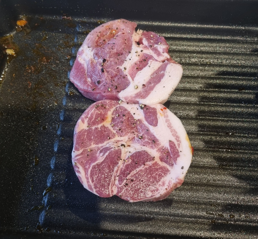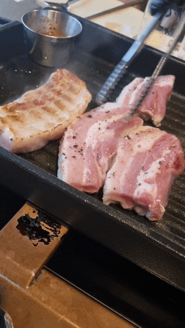 - 고기의 두툼한 식감과 정성스럽게 구워지는 모습이 매력적입니다.