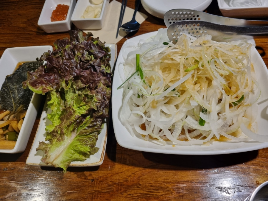 - 양파 소스와 샐러드는 돼지갈비와 함께 즐기기 좋고, 맛이 정말 존맛탱입니다.