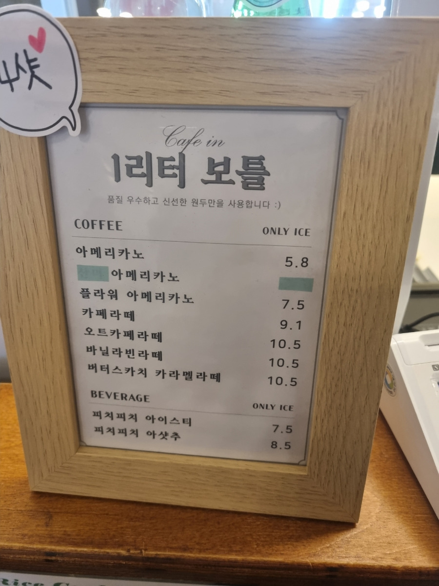 - 커피, 차, 에이드 등 다양한 음료를 제공하며, 1L 커피도 판매!